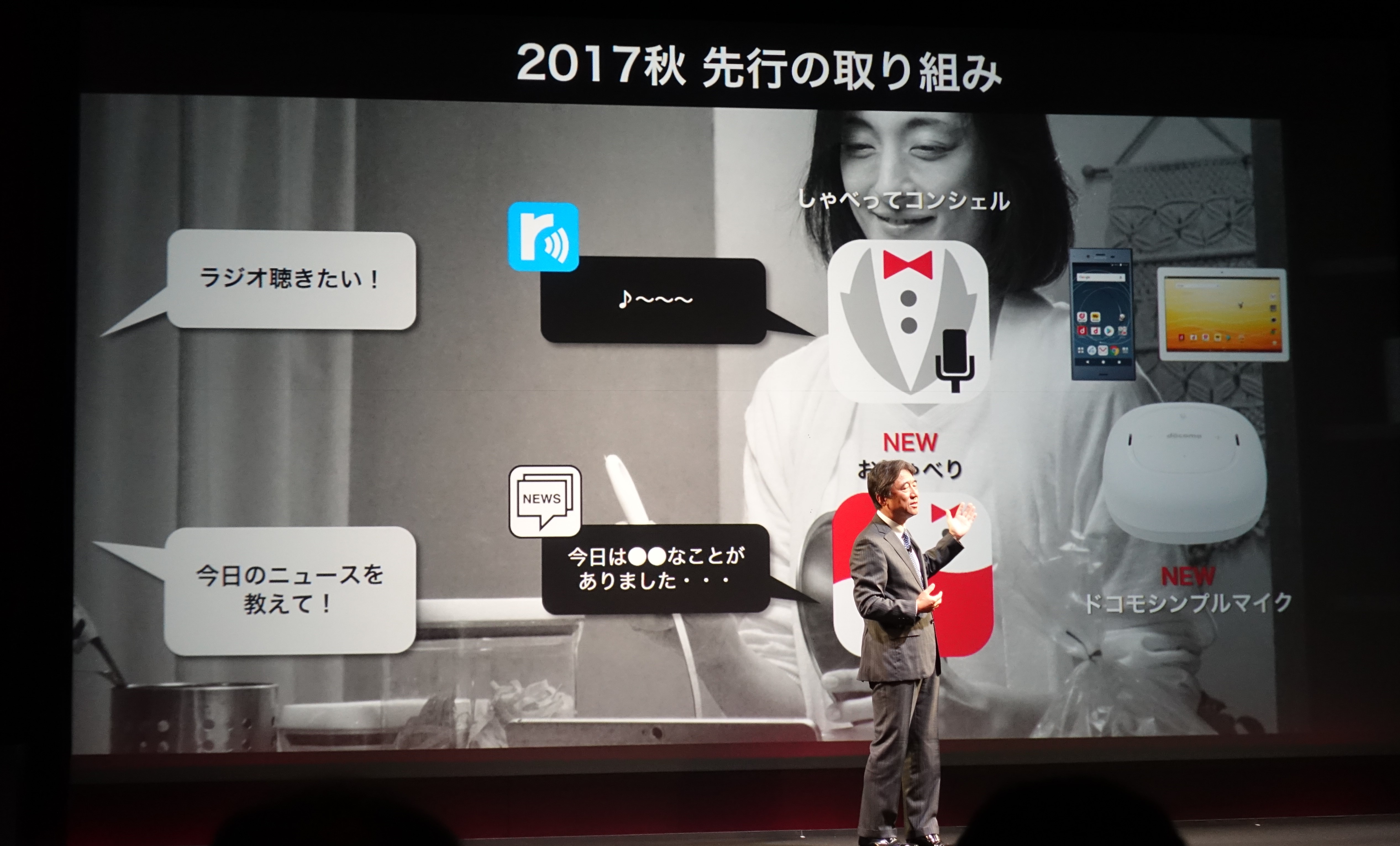 ほかにも今秋から、音声で操作してラジオをつけたり、音楽を再生したり、外出先の家族にメッセージを送信したりできる「しゃべってコンシェル」と「おしゃべりアプリ」というふたつのサービスを提供開始予定。2018年春には、さらに進化した対話で利用できる「AIエージェントサービス」の提供を開始する予定です。
