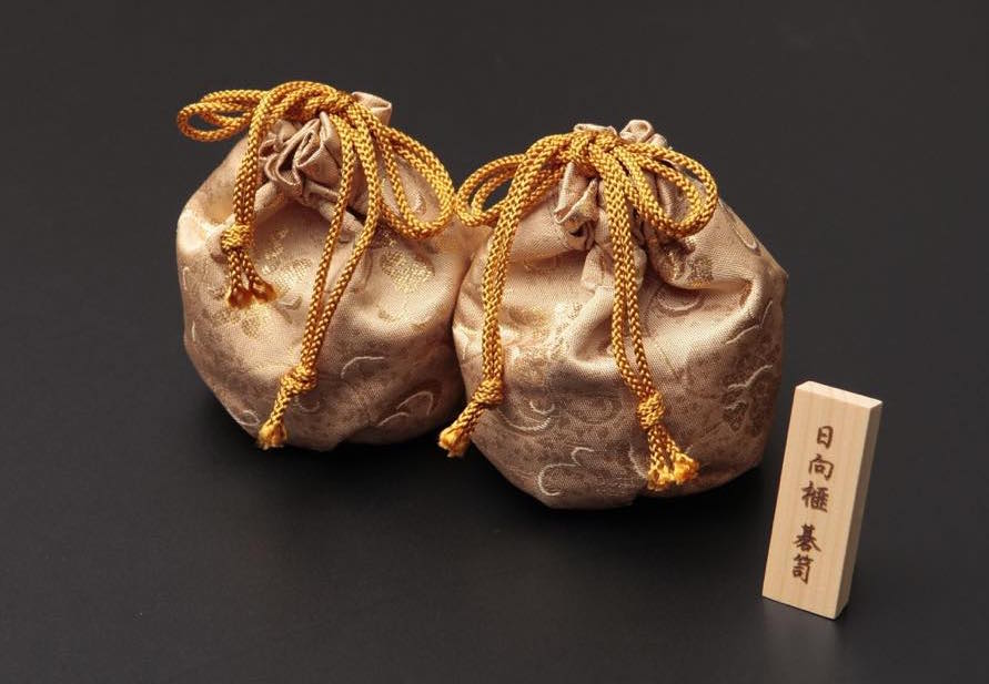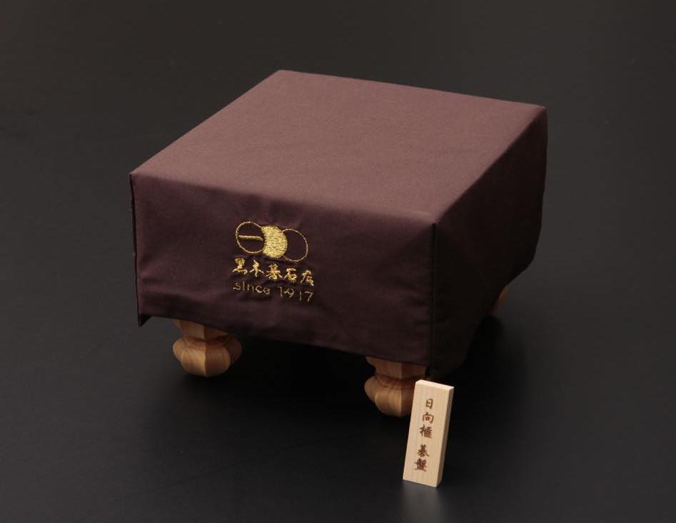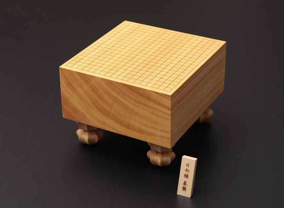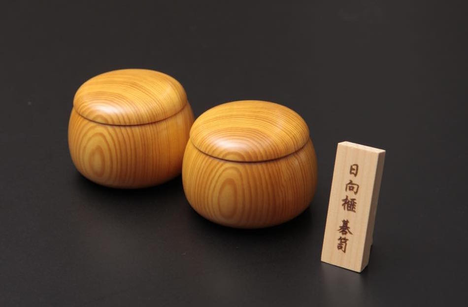 碁盤は、最高級材と言われる南九州産の「日向榧(ひゅうがかや)」を使用し、すべて柾目盤でご用意。また、碁石を入れる容器である碁笥(ごけ)の材料にも「日向榧」を使用。宮崎県伝統工芸士である「西川ろくろ木工」の西川 嵩氏により作られた逸品です。西川氏製造の証である刻印入り。