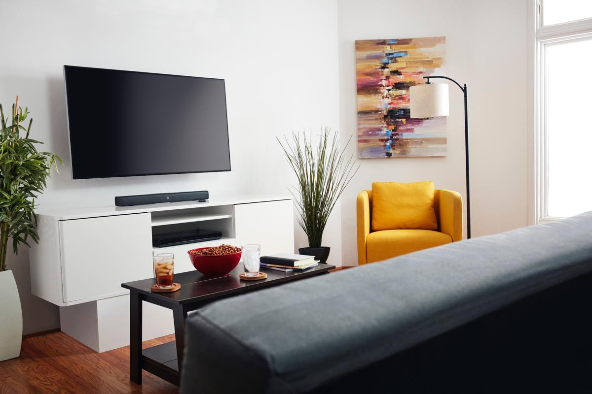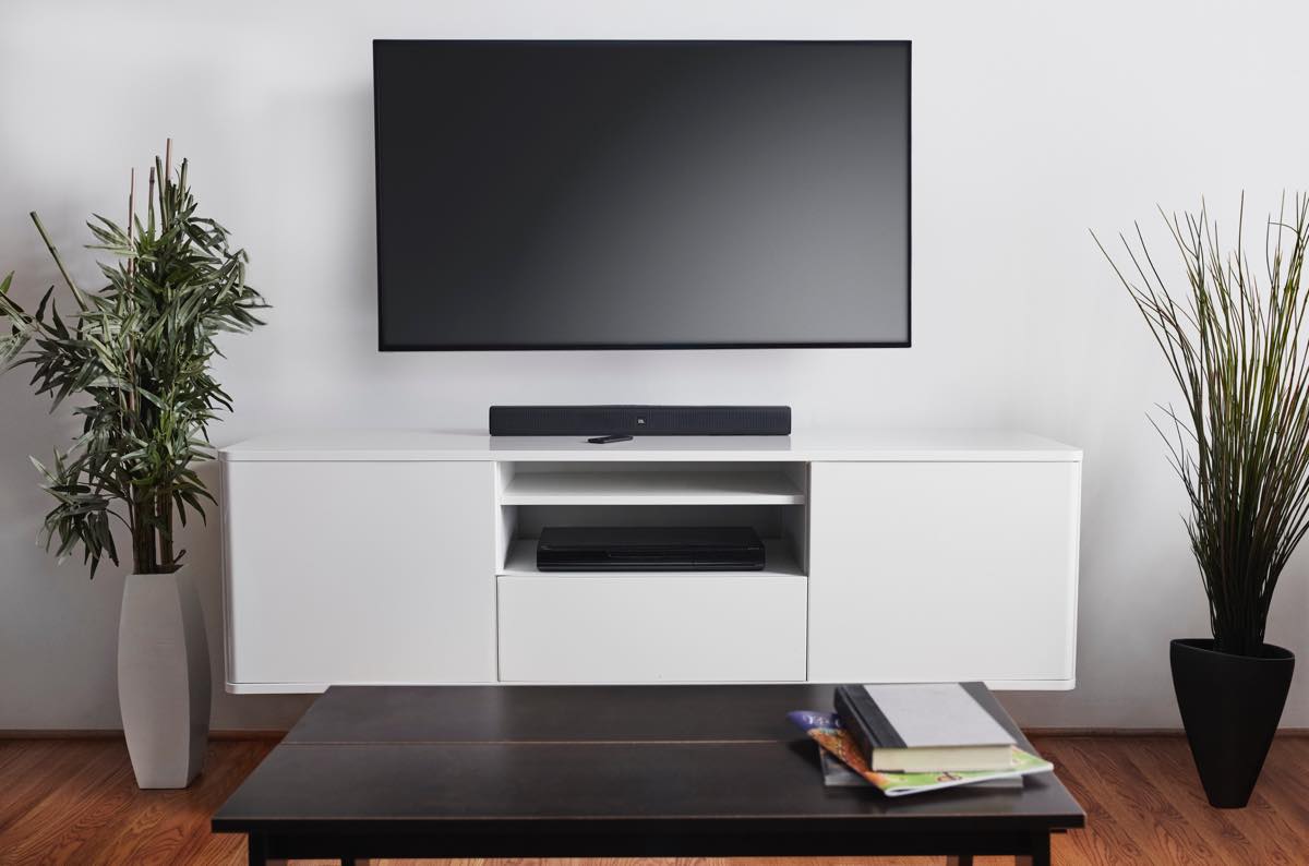 サウンドバーはTVや部屋に合わせやすい幅614mm×高さ58mmのスタイリッシュかつコンパクトなデザインを採用。TV前の限られたスペースでもスマートに設置が可能です。さらに、サウンドバーには、38mm径ツイーターと50mm径ウーファーを各2基と、低音を増強するデュアルバスポートを搭載しているため、JBLならではのパワフルな重低音を思う存分楽しめます。