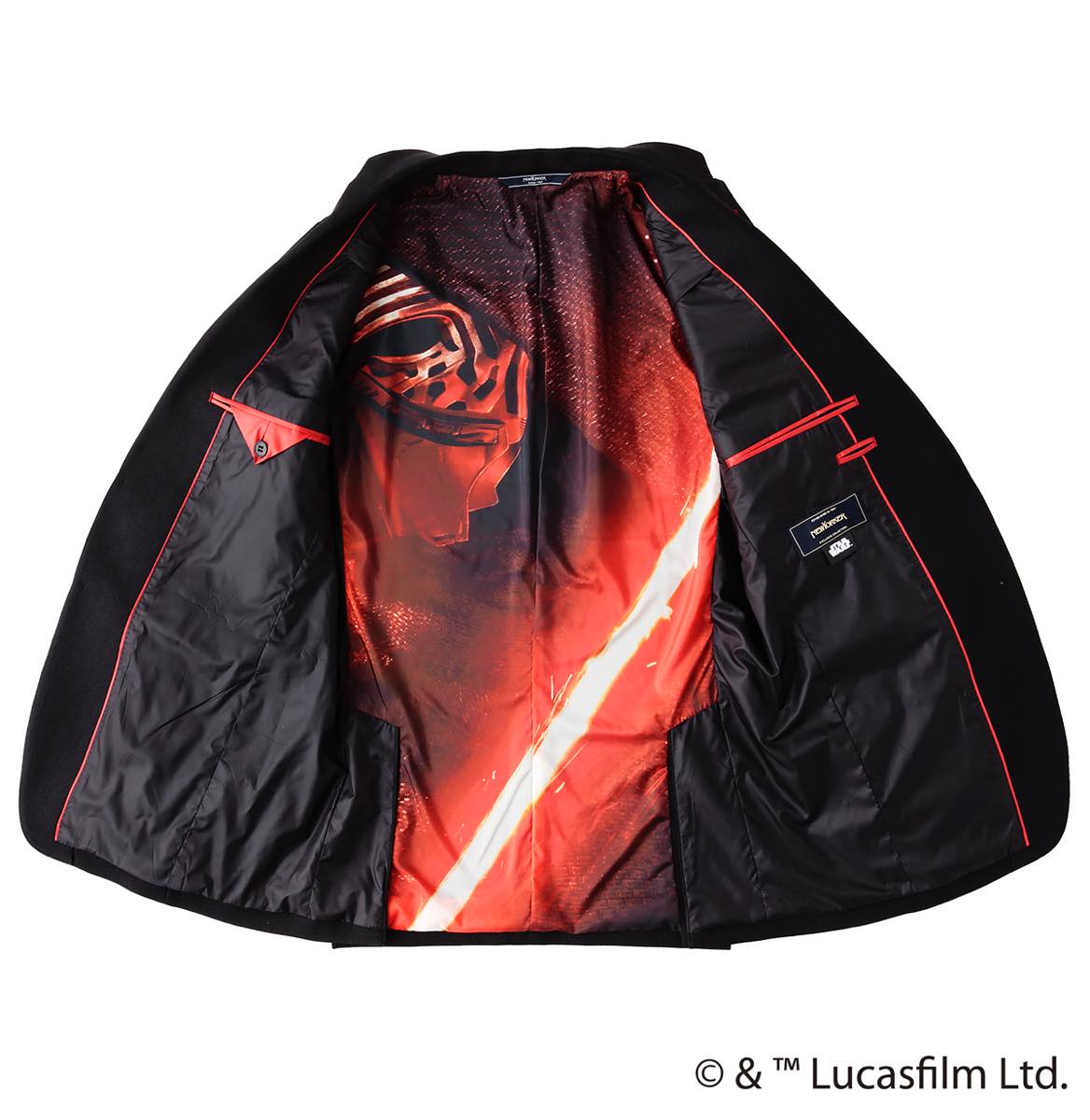 ブレザーは、第7作目で登場した「カイロ・レン」をモチーフとして採用。ライトセイバーを携えたダークサイドの妖しい魅力を裏地に、赤と黒のカラーリングでピクチャー・プリントしています。また、フロントボタンやカフスボタンにも、3Dプリントによる「カイロ・レン」をデザイン。表地はツイード素材を採用しており、コートのようにも着用できます。価格は7万4520円。