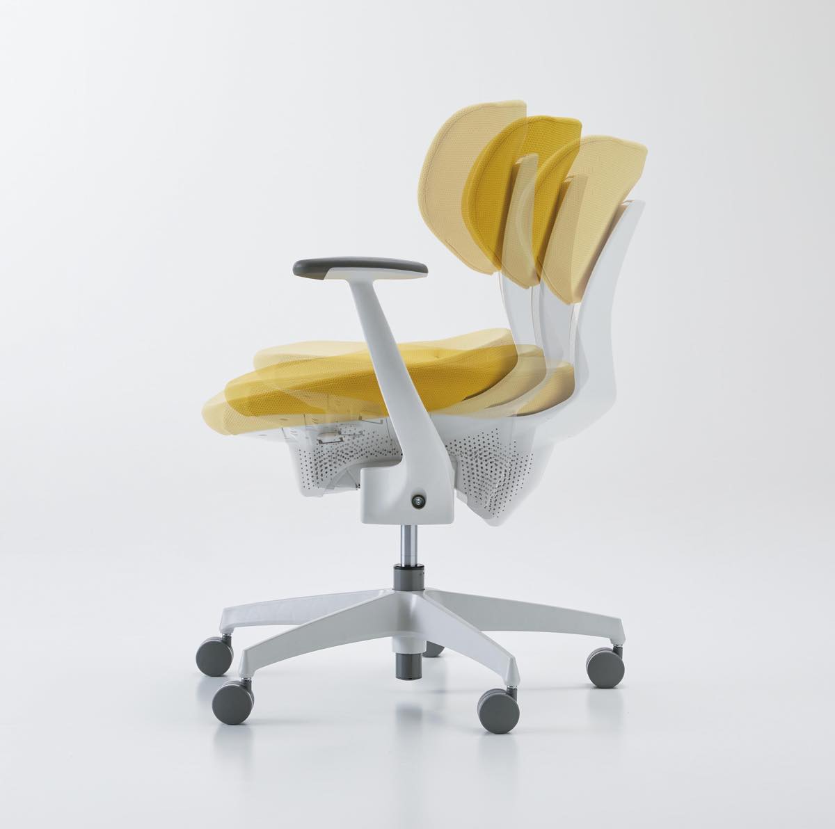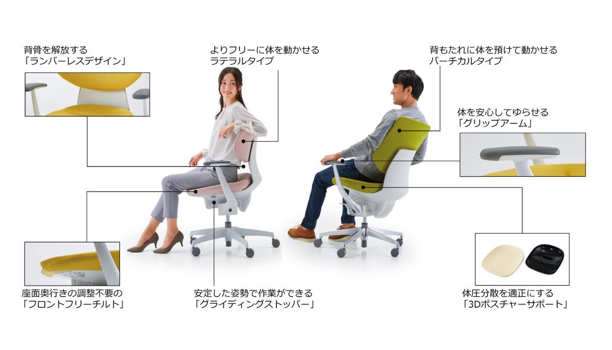 また動き続けることにより骨盤を最適な角度でキープ、背骨のS字カーブを自然に保てるというメリットも。さらに揺れ続けることによって体圧がバランスよく分散され、カラダの一部分にだけ負担をかけることがなくなります。使う人の体格に合わせて自然にメカが追随するため、ロッキングの強さや座面奥行きの調節もいりません。
