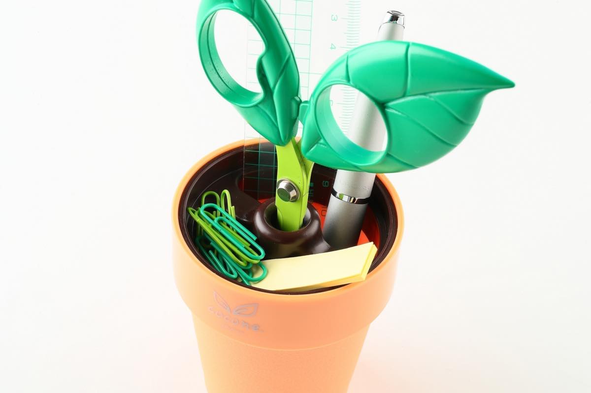 そんな中、11月8日に発売された「cocone」は、観葉植物デザインのハサミと、植木鉢型スタンドがセットになっている商品。置き場所が定まらず、つい置きっぱなしにしてしまうハサミだが、これなら定位置に戻したくなるため、デスクの上もスッキリ! 植木鉢の中につい片付けたくなる形状は、自宅で使う場合でも小さな子供の「お片付け」を自然とアシストしてくれる。