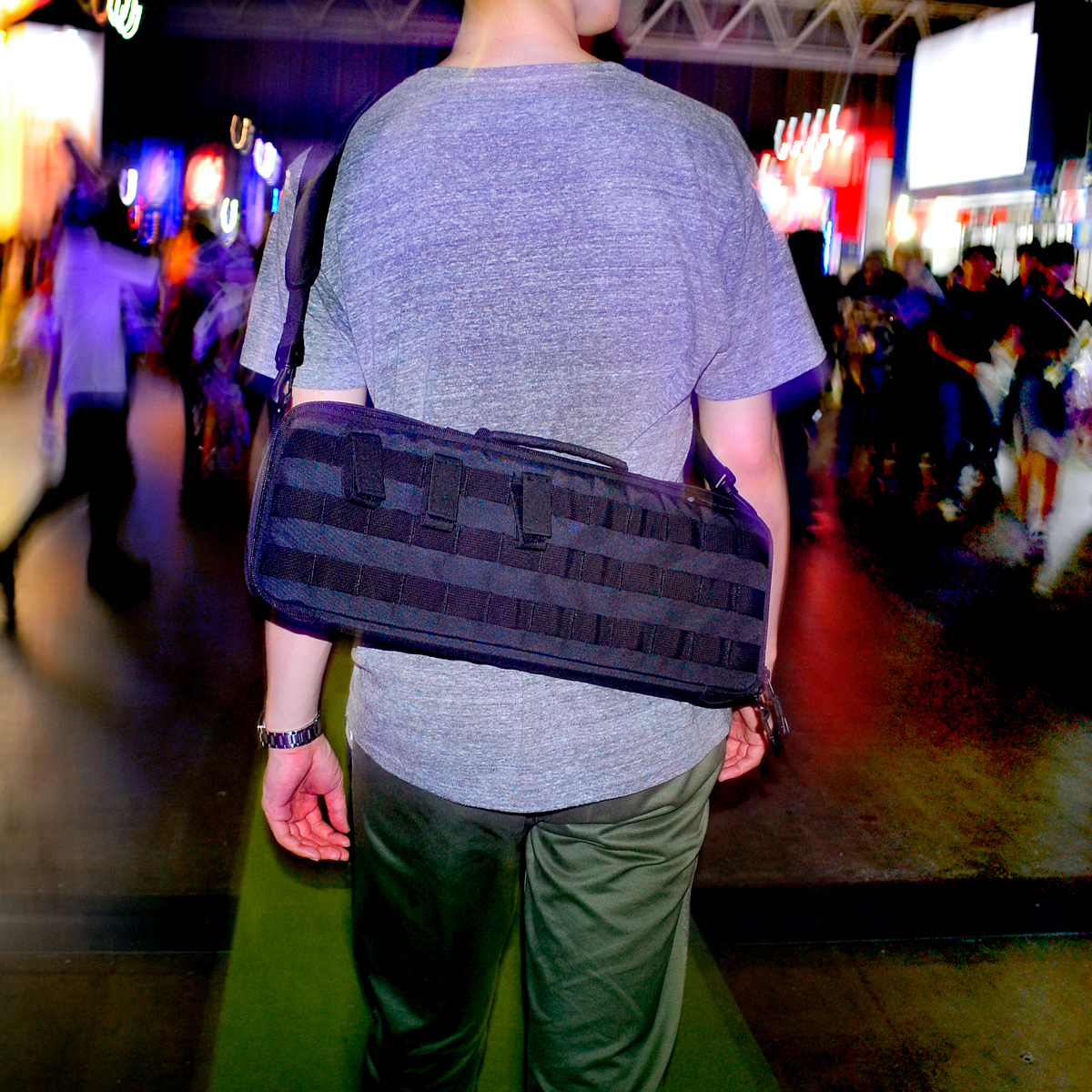 全体のデザインはミリタリーテイスト。バッグ表面にベルクロバンジーを3本セットし、マウスパッドを丸めて固定したり、ヘッドフォンをかけるなど、使い方は自由です。また、滑りにくく耐久性の高い素材を使用した着脱式ショルダーストラップとハンドルを装備しています。