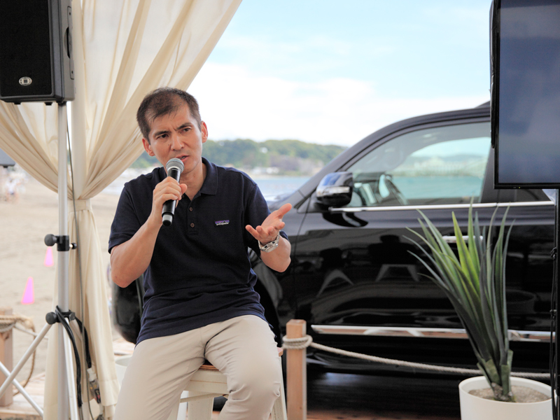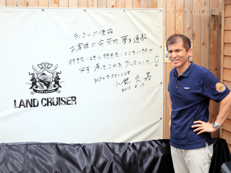 いつもはクリーンディーゼルエンジンを搭載する「ラングクルーザー プラド」が展示されているランドクルーザービーチハウス in JAPANですが、この日は、黒い布を被せられたクルマが特別に置かれていました。ニュー200シリーズのローンチイベントが始まると、ランドクルーザーの開発を手掛ける小鑓貞嘉(こやり・さだよし)氏が登場。自らの手で、新型200シリーズを披露しました。