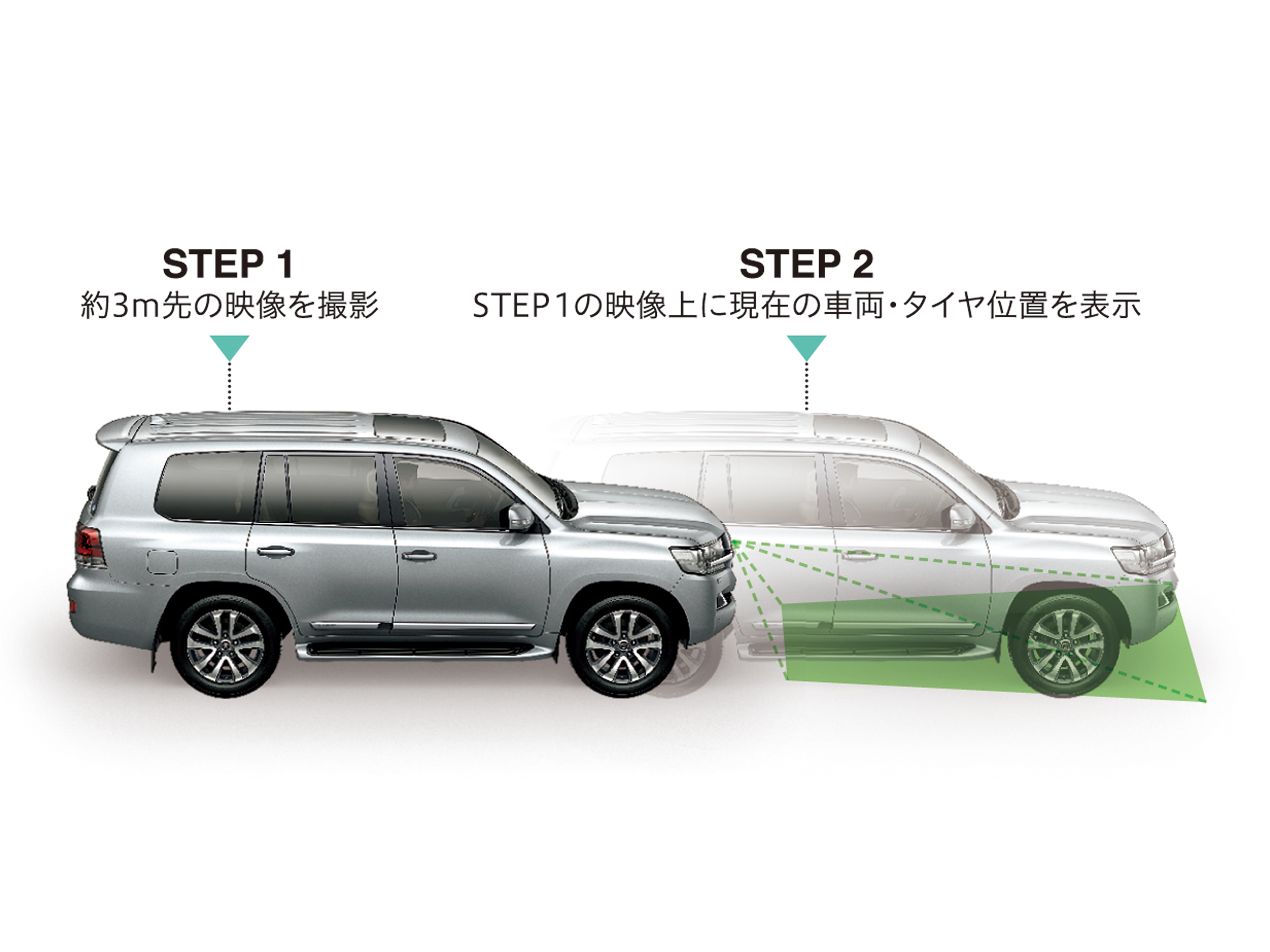 そのほか、新しい運転支援機能として興味深いのが、“アンダーフロアビュー”と“フロントビュー回転表示”。前者は、あらかじめ撮影しておいた約3m先の路面画像と、現在の車両・タイヤ位置を重ねることで、車両下の状況を確認できる機能。後者は、車内のディスプレイ上に地平線を表示することで、自車の傾きを見る仕組み。いかにもオフロードで活躍するランクルらしい機能ですね。