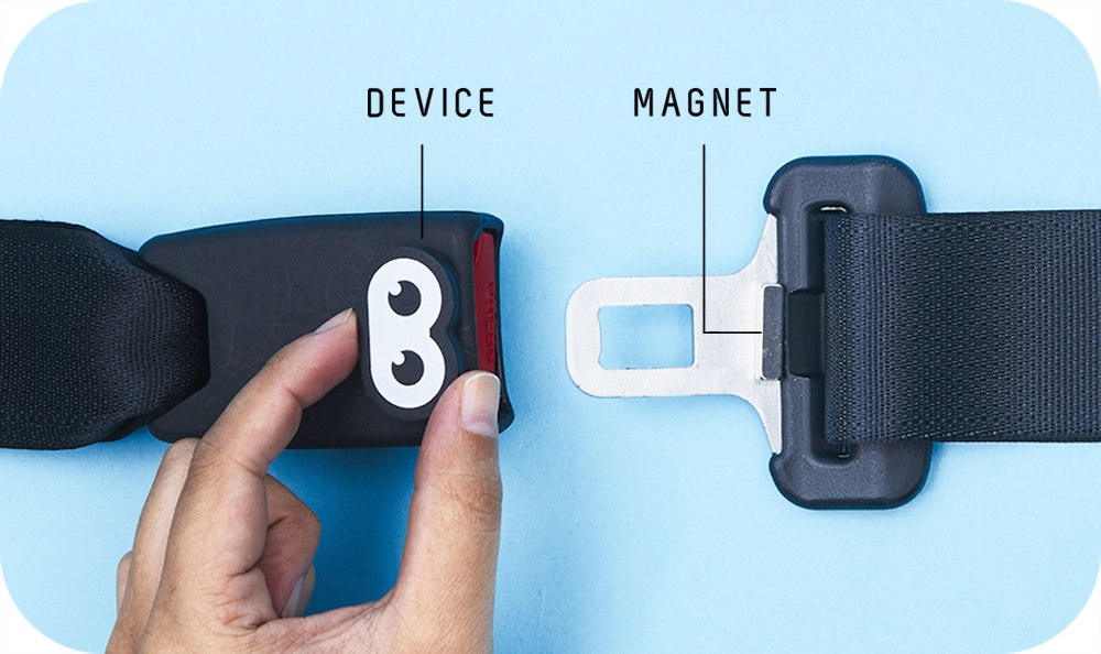 シートベルトのバックル部分についた「目」のような「B」のようなモノ。これが株Fun Solutionsより登場した「Bellton(ベルトン)」(予定価格5184円)です。この「ベルトン」はバックル部分にくっついていており、シートプレートが大好き。シートプレートがしっかりはまっている、つまりシートベルトを着用していると、「ベルトン」は喜び、子どもはスマホ・タブレットを使って、予め登録したアプリゲームなどで遊べます。