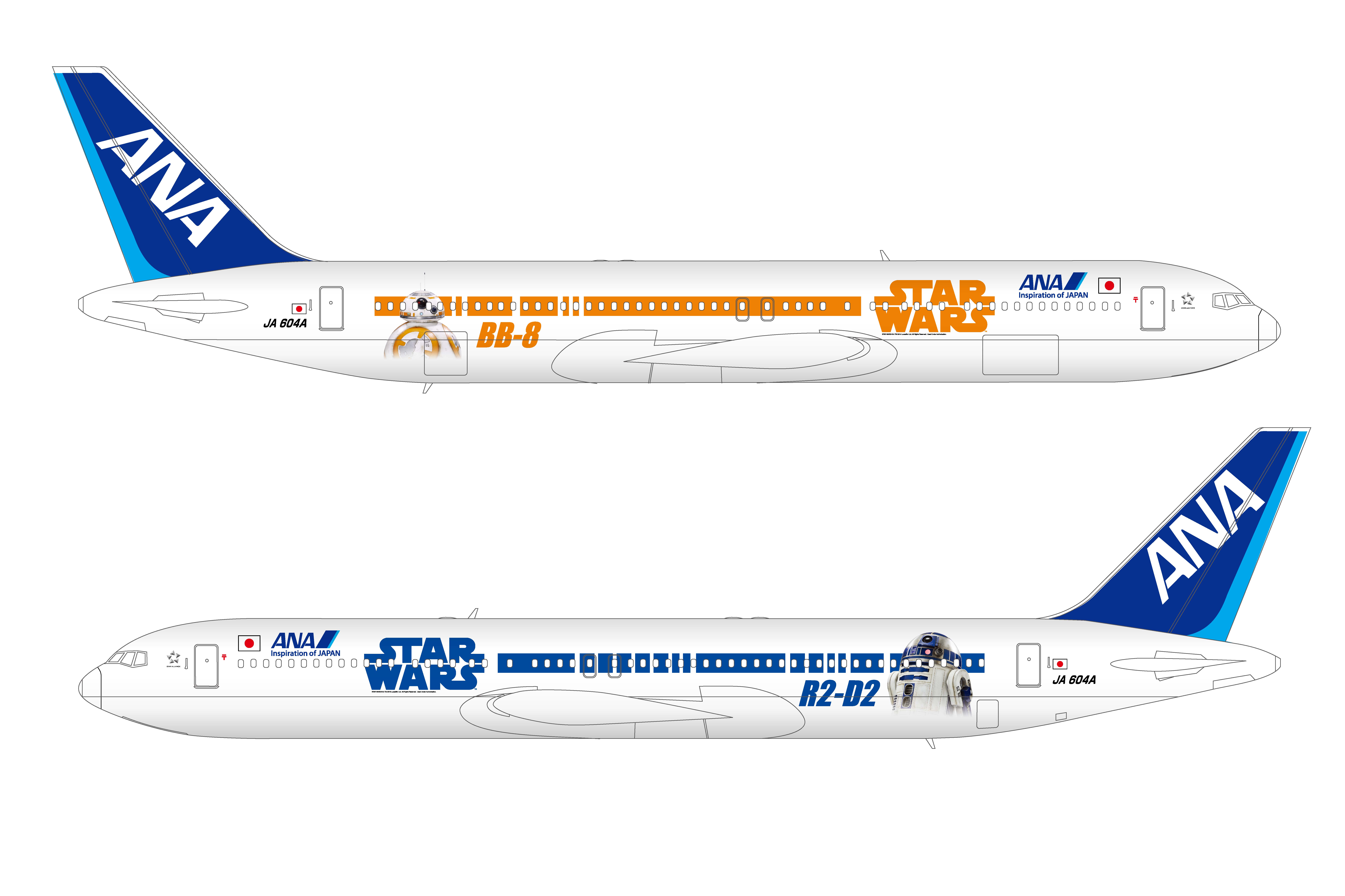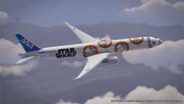 新たに登場した「BB-8™ ANA JET」は12月18日公開の新3部作のうち1 作目 「スター・ウォーズ/フォースの覚醒」に登場する新キャラクタ-「BB-8」が描かれている。この機体は、 2016年3月頃、北米路線を中心とした国際線に就航する予定だ。