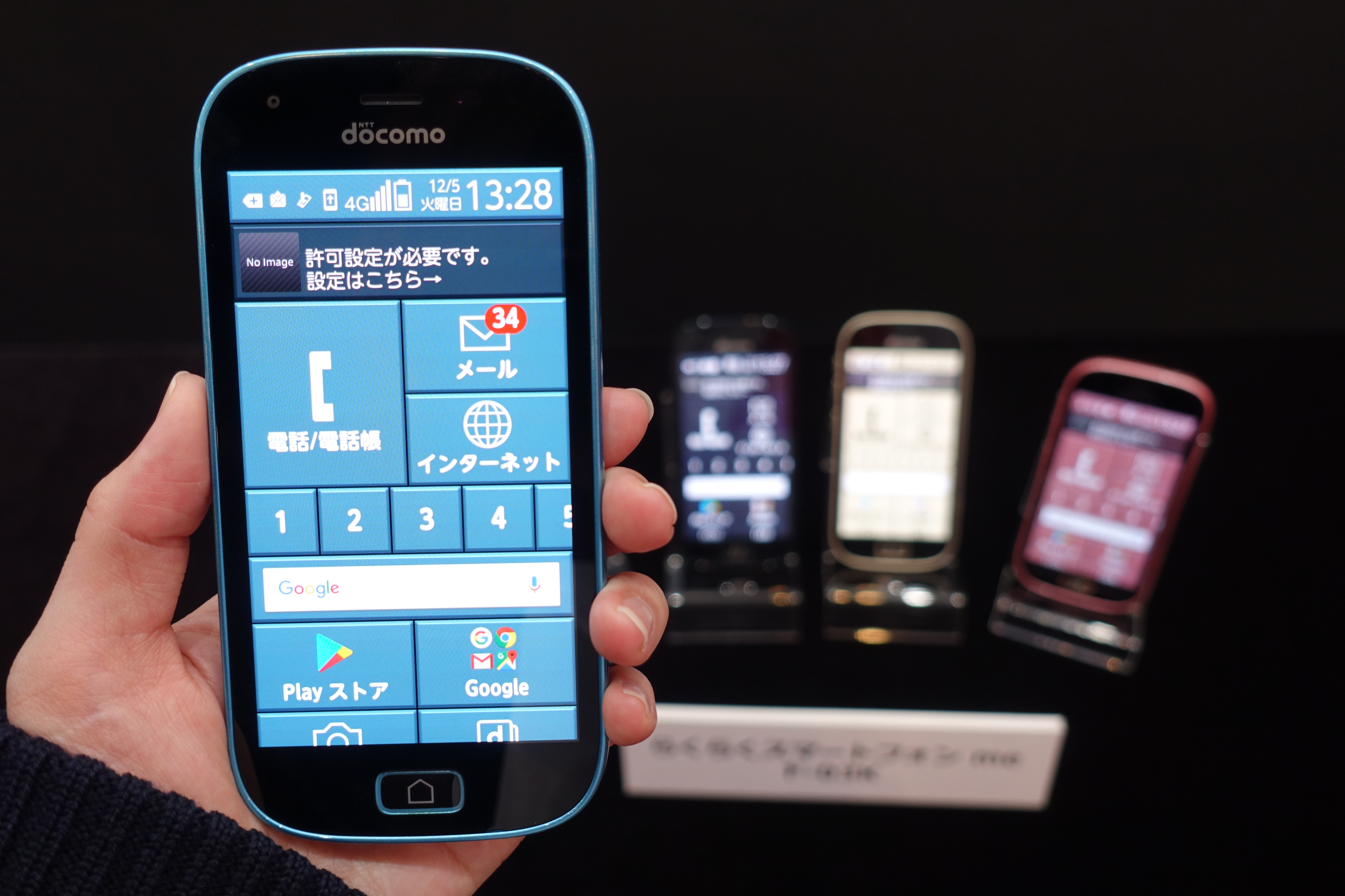 スマホを初めて持つ人でも安心できる機能を搭載したシニア向けスマホ「らくらくスマートフォン me F-03K」も発売されます。カラーは、ブルー、ゴールド、ピンク、ブラックの4色展開。2018年1月より発売予定です。