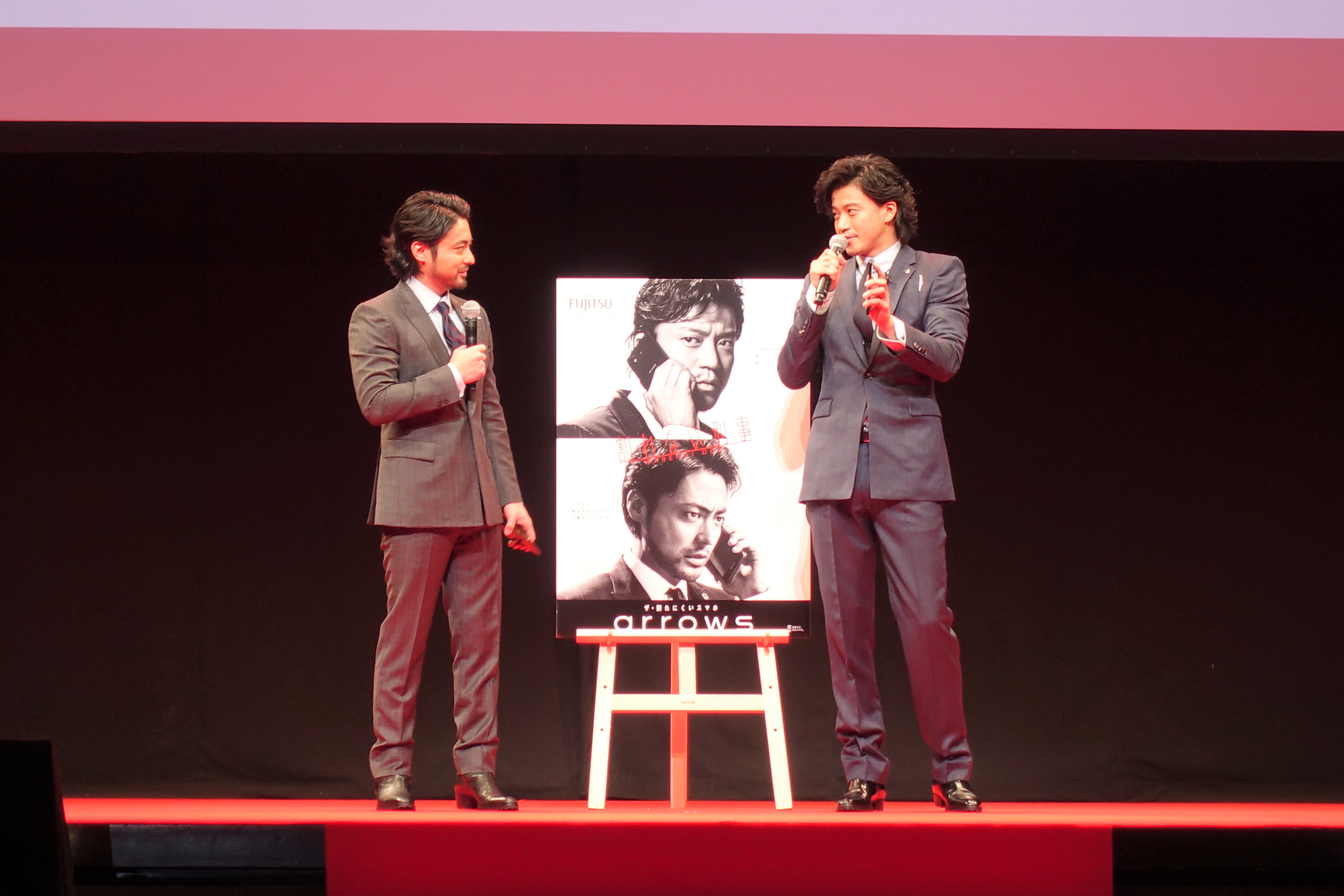 ▲山田孝之さん(左)、小栗旬さん(右)は、arrows NX F-01Kを実際に落とすも、「まったく割れない!」とコメント