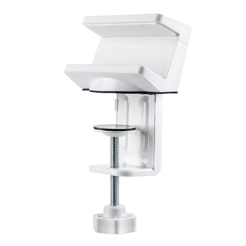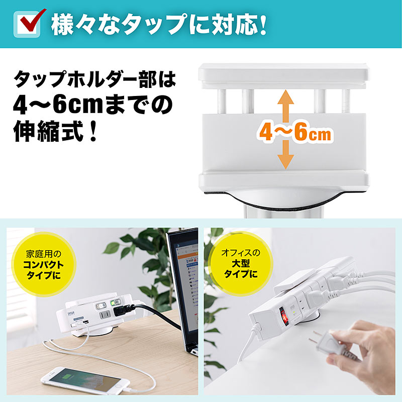 机に固定するクランプ部分は、厚さ1.0~5.5cmまで対応。さらに、タップのホルダー部分も幅4.0~6.0cmのモノに対応しています。実はこれまでもクランプで机に固定するタイプの製品は発売されていたのですが、タップ部分は4口タイプや6口タイプなど、ラインナップされているものの中から選ばざるをえませんでした。しかしこの製品なら、幅さえ適合すれば、自分が普段使っているコンセントとUSBポートがどちらも付いているタイプや、USBポートがたくさん付いているタイプなども固定できます。