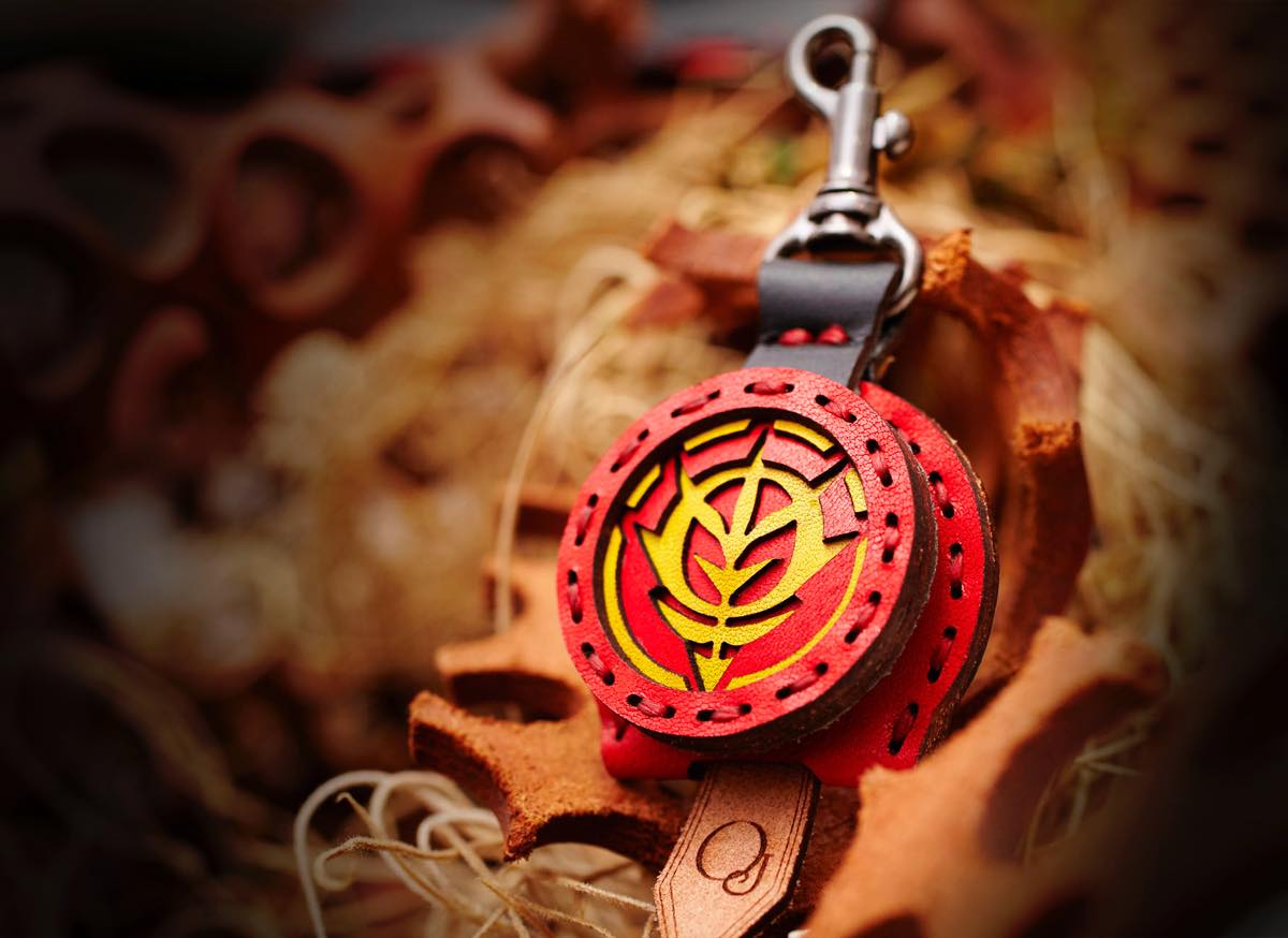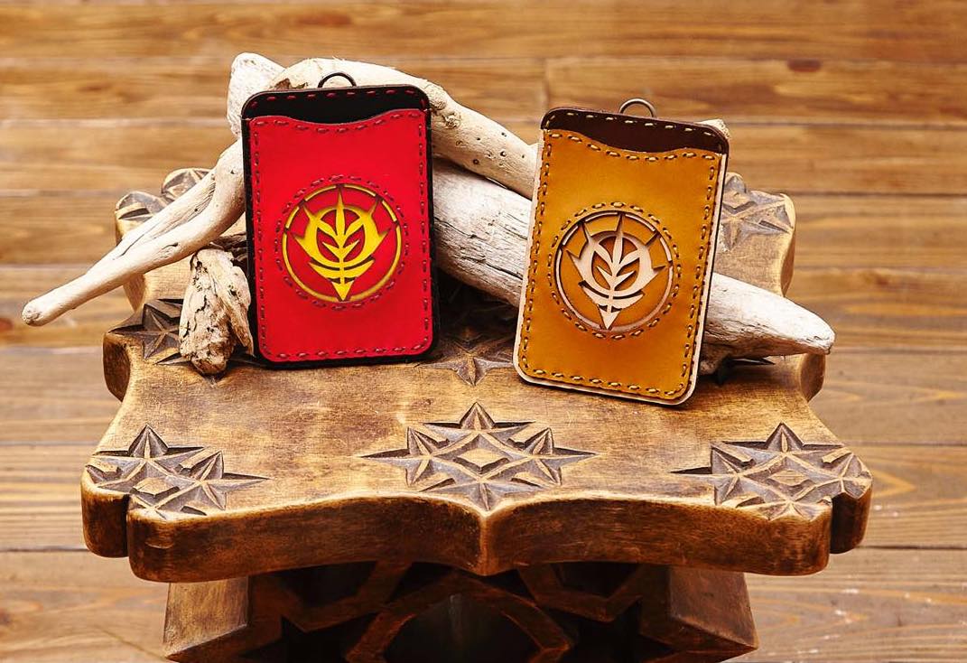 各アイテムに輝くエンブレムは、革を重ねて立体感を表現するOJAGA DESIGN得意の技法によるもの。手にしたらジオン公国の一員になったような気になれるかも。キーキャップはアクセサリー的にバッグに付けるだけでもOK。パスケースはネックストラップなどを付けられるリング付き。カードケースはマチ付きポケットが二つあり複数のカードを収納できます。
