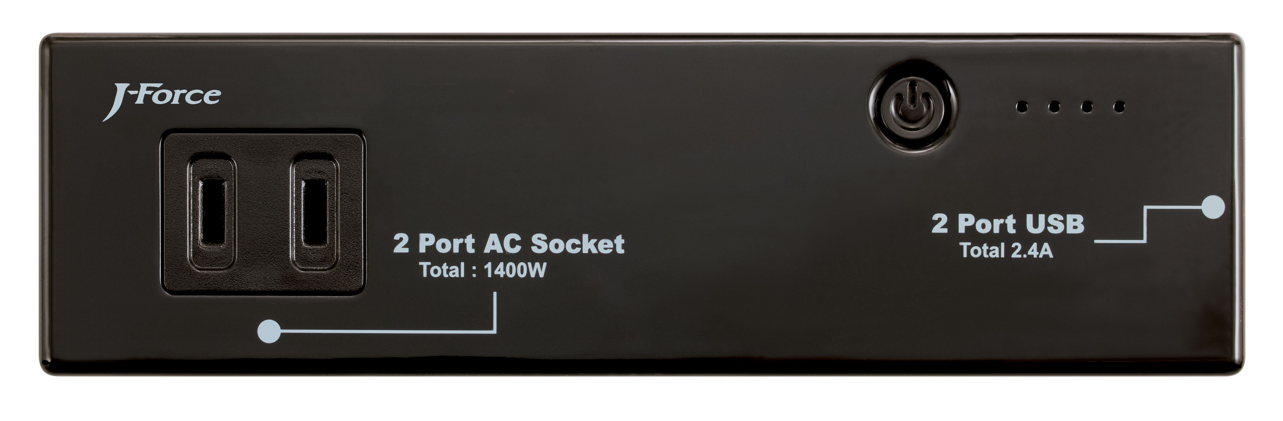 本体をコンセントに挿せば自動で充電開始、残量ゼロから約3.5時間で満タンに。電源タップの出力は2口合計1400W。バッテリー本体を充電しながらスマホなどを充電でき、その場合USBポートの出力は最大5V/1.4A。充電完了後は最大5V/2.4A、モバイルバッテリー時は5V /1.5Aと余裕。