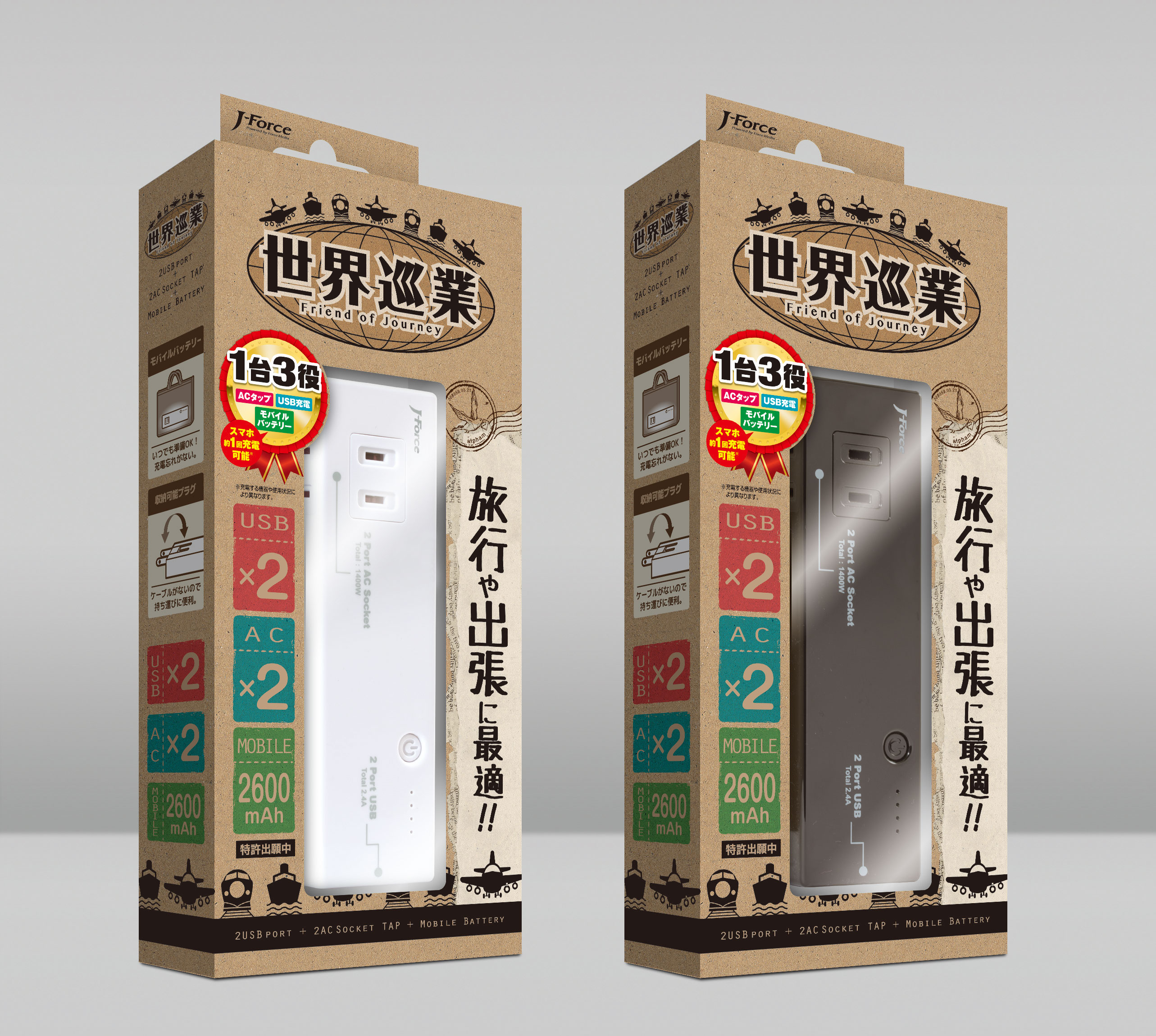 フォースメディアが発売する「世界巡業」(実売想定価格5378円)は、AC電源2口、USBポート2口、モバイルバッテリー(2600mAh)の3つの機能を備えたアイテム。