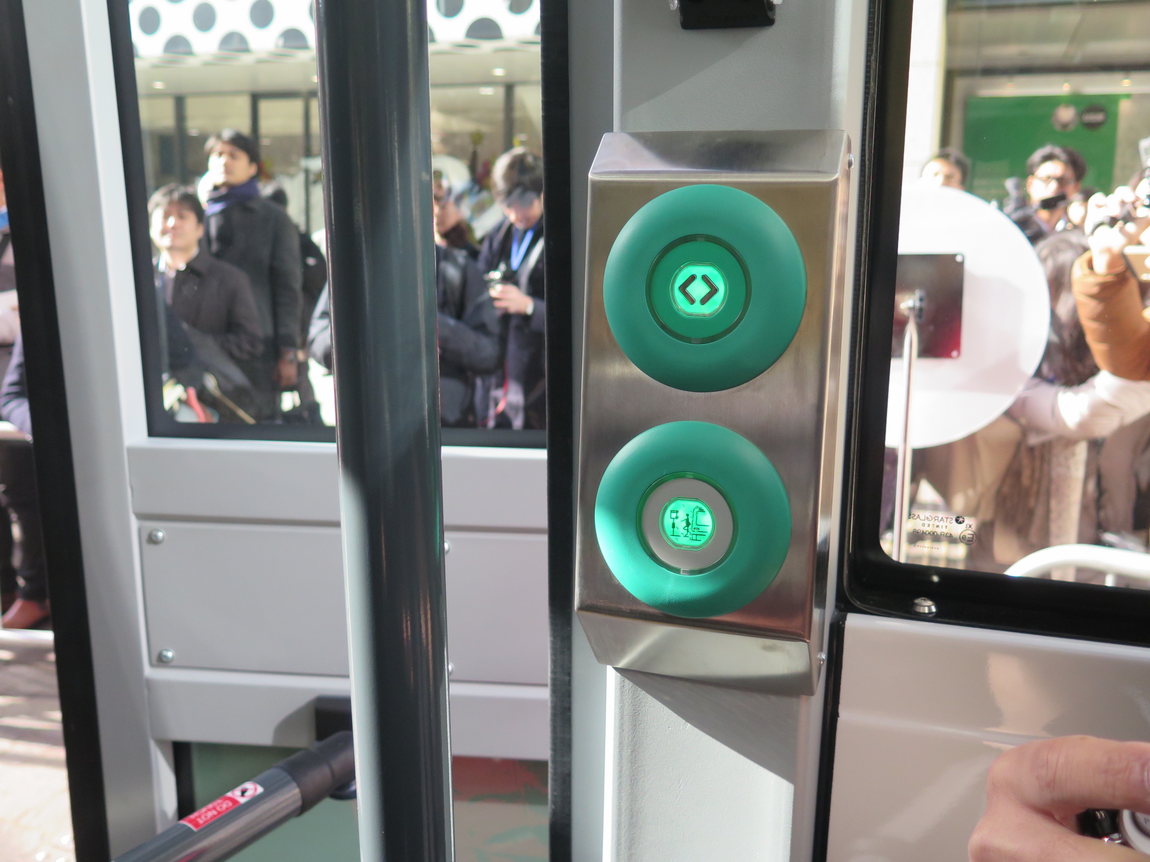 ▲車内のドアの近くには、乗客が操作できるボタンも設置