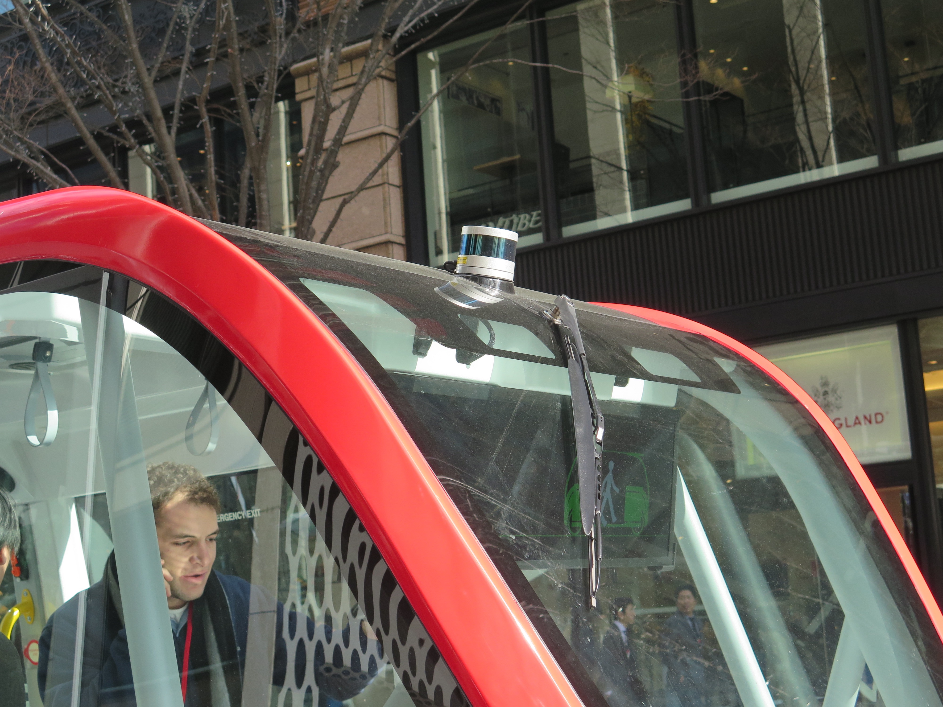 NAVYA ARMAの車内には11の座席があり、15名まで乗車可能。GPSなどで自車位置を測定し、車両の前後に取り付けられた「LiDAR(ライダー)センサー」で障害物などを検知する仕組みです。