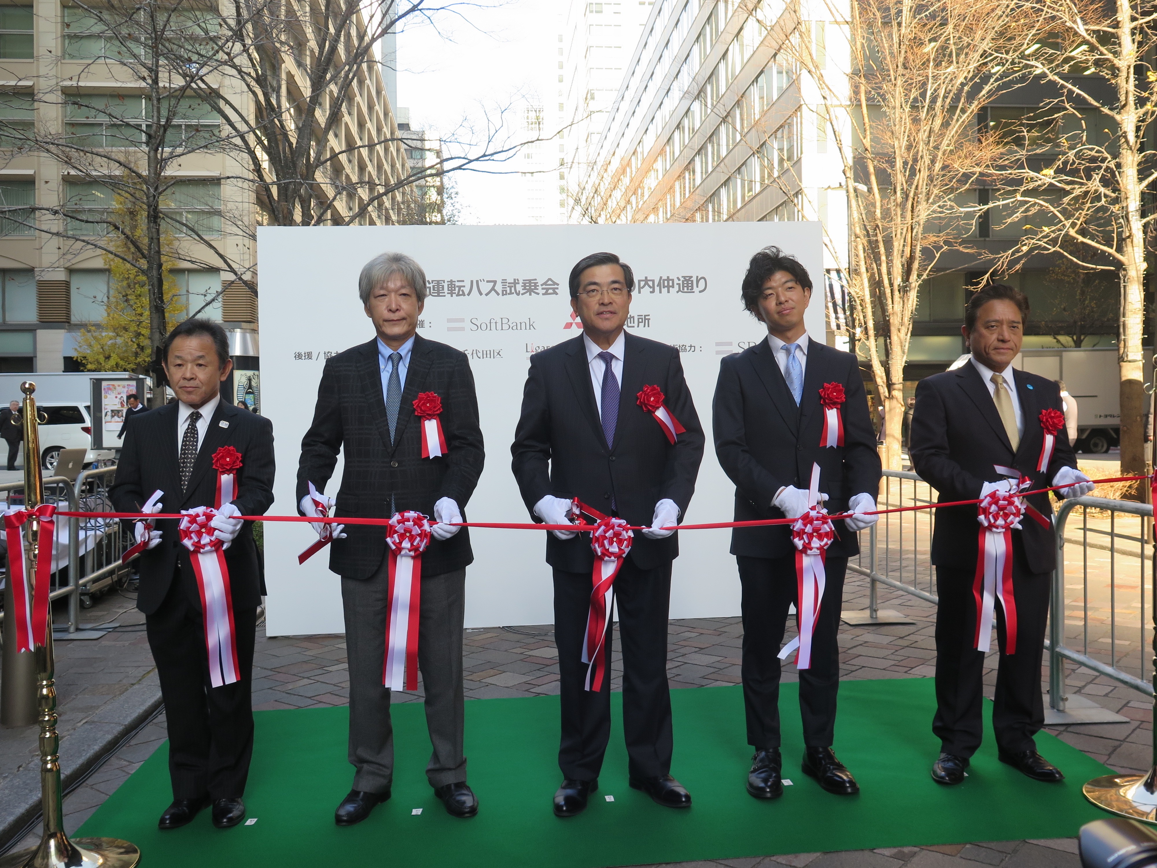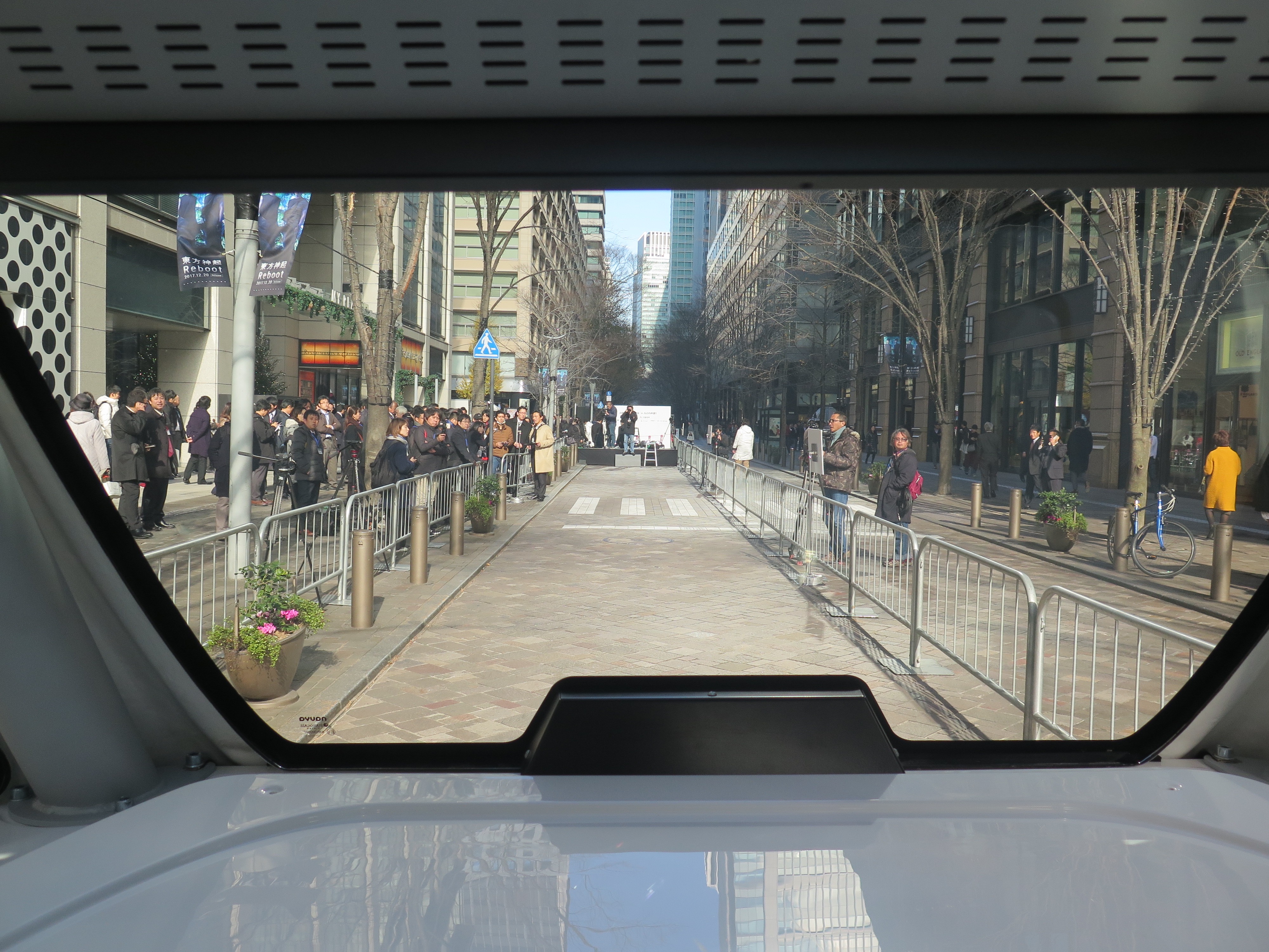 試乗会は、丸の内仲通りの一部区間を交通規制し、一般車両は進入できない環境で実施。関係者や報道陣は片道約40mの往復を、事前に応募した一般の方は片道約100mの往復を、最高時速約5kmで走行しました。