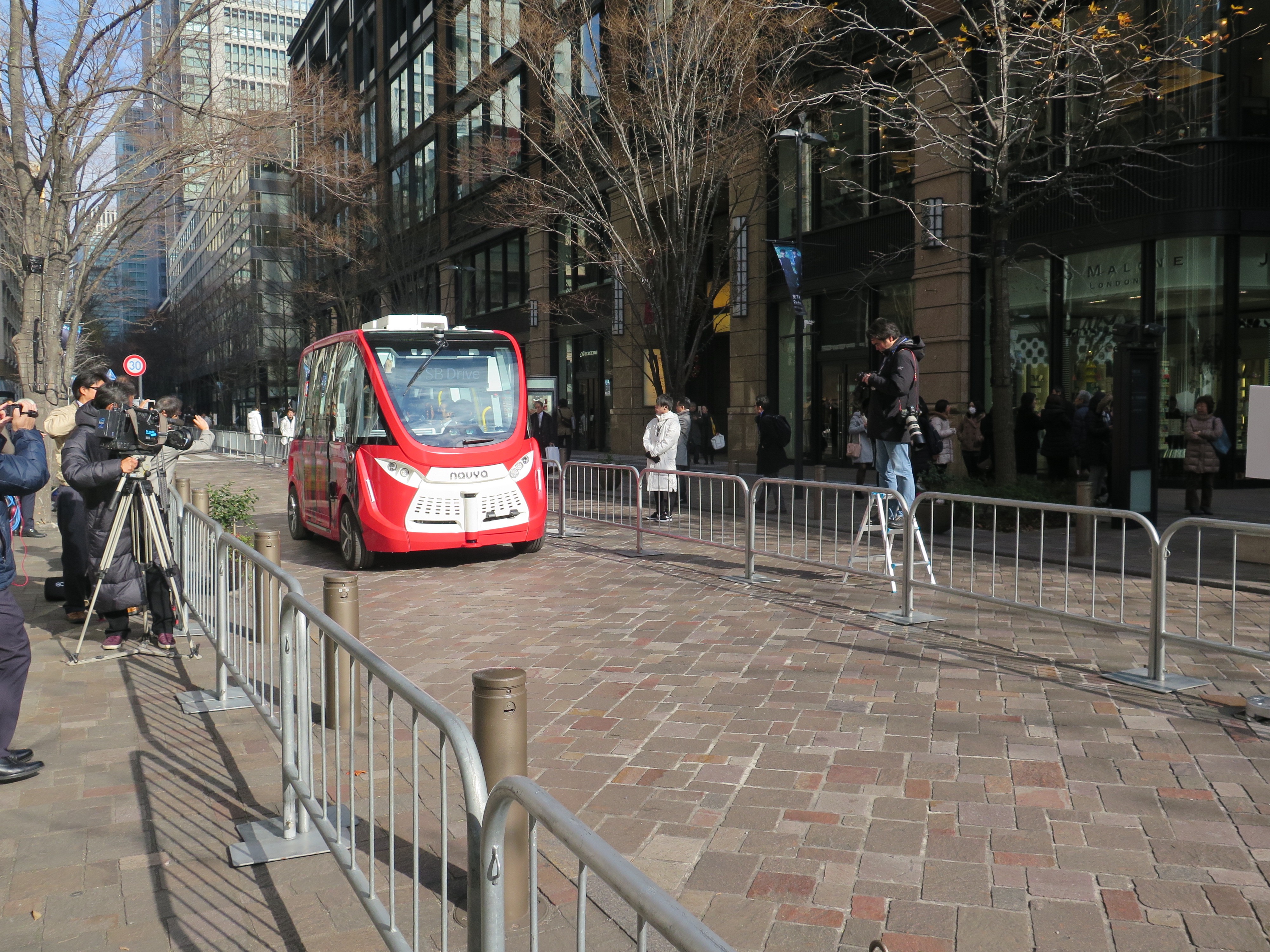 ▲丸の内仲通りに交通規制をかけてフィールド実験を実施。NAVYA ARMAの設計上の最高速度は45km/hで、最長13時間の走行が可能