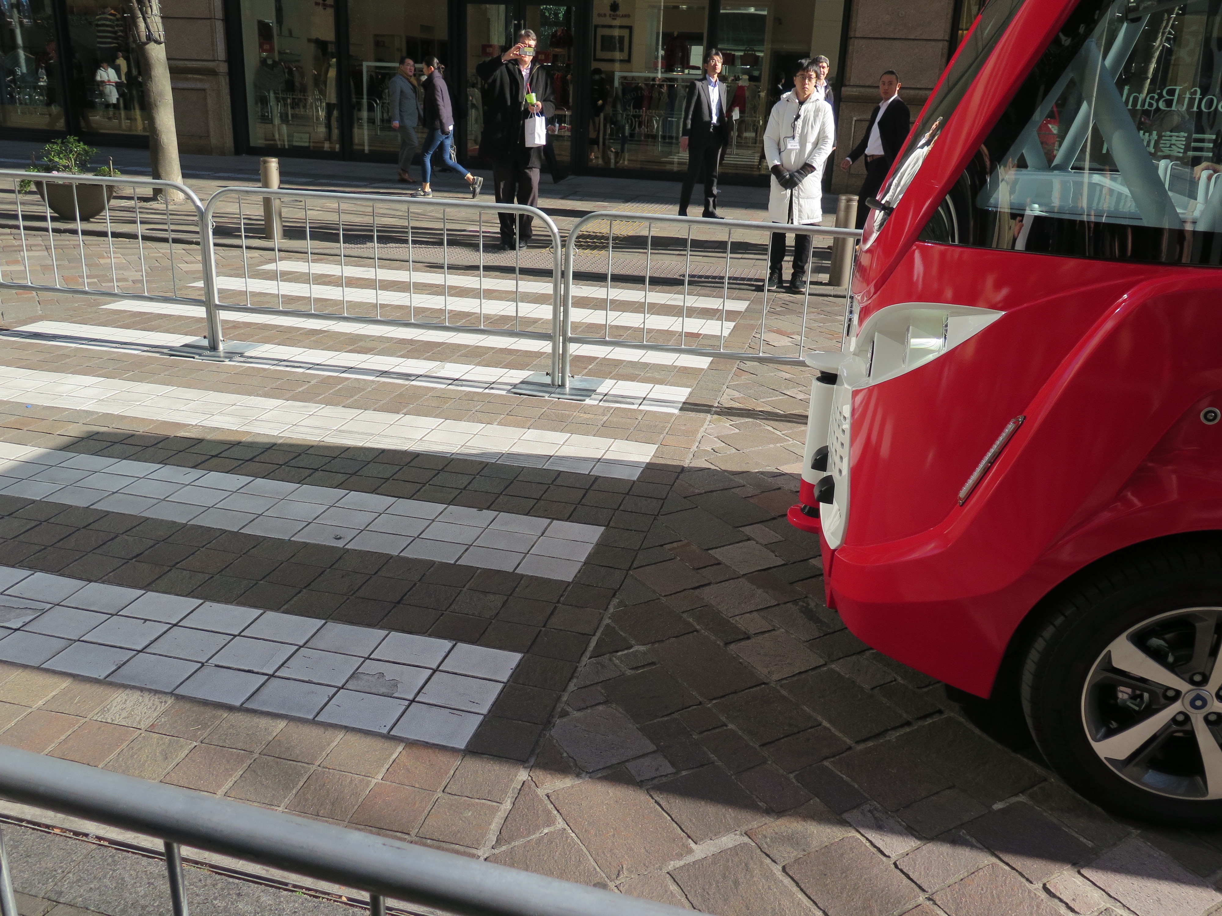 筆者も試乗させていただきましたが、低速ということもあり、テーマパーク内のカートに乗っているかのような気分でした。スムーズな乗り心地で、センサーが横断歩道を検知し一時停止、通行人がいないことを確認して運転を再開するといったデモンストレーションも体験できました。
