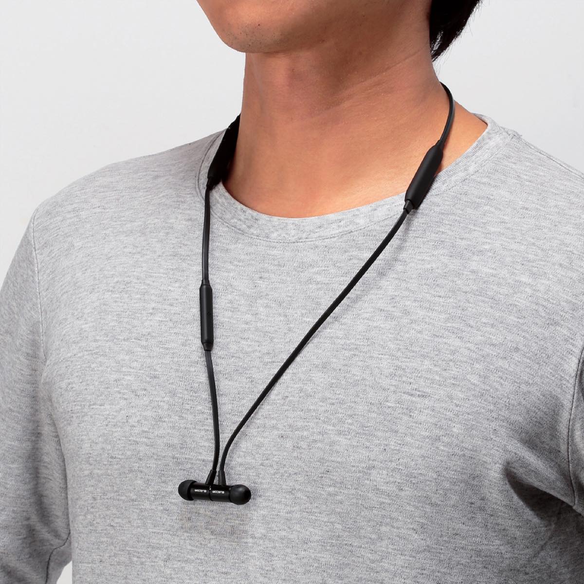 不快な振動も抑制します。イヤホン部にマグネットを内蔵し、装着しないときは左右のイヤホンをくっつけて首にかけておけます(自動でイヤホンの電源がオフになる親切設計)。フル充電時の連続再生時間は約5.5時間です。