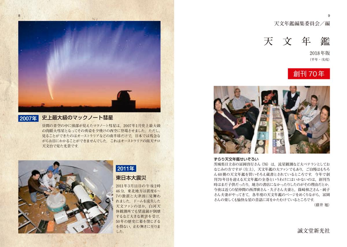 創刊70年目を迎えた今回の2018年版。カラーページを増やし、天文年鑑の70年の歴史を振り返るとともに、この70年の間に起こった貴重な天文現象の写真を紹介。その他にも、2017年に話題となった「アメリカ皆既日食」や「ジョンソン彗星」の解説、木星や土星などの画像、さらには今年2018年7月31日に発生する「火星の大接近」についてもカラー口絵で紹介していきます。