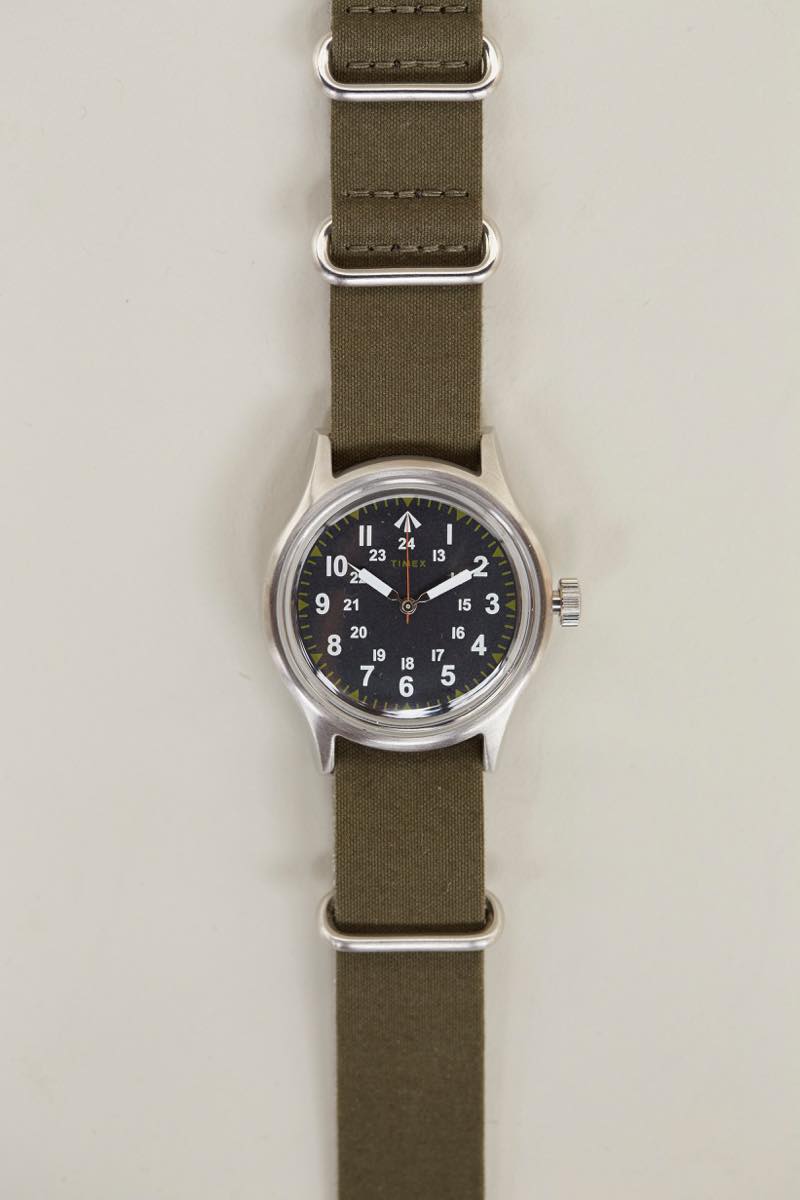 ベースになっているのはTIMEXの数あるシリーズの中でも、“実用時計の頂点” “究極のベーシック” として認められるベストセラーモデル「Camper(キャンパー)」。かつてベトナム戦争において修理や交換を必要としないディスポーザブルウォッチとして開発された同モデルで、戦中は米国兵に支給され、やがて民生品として販売されたという出自を持っています。