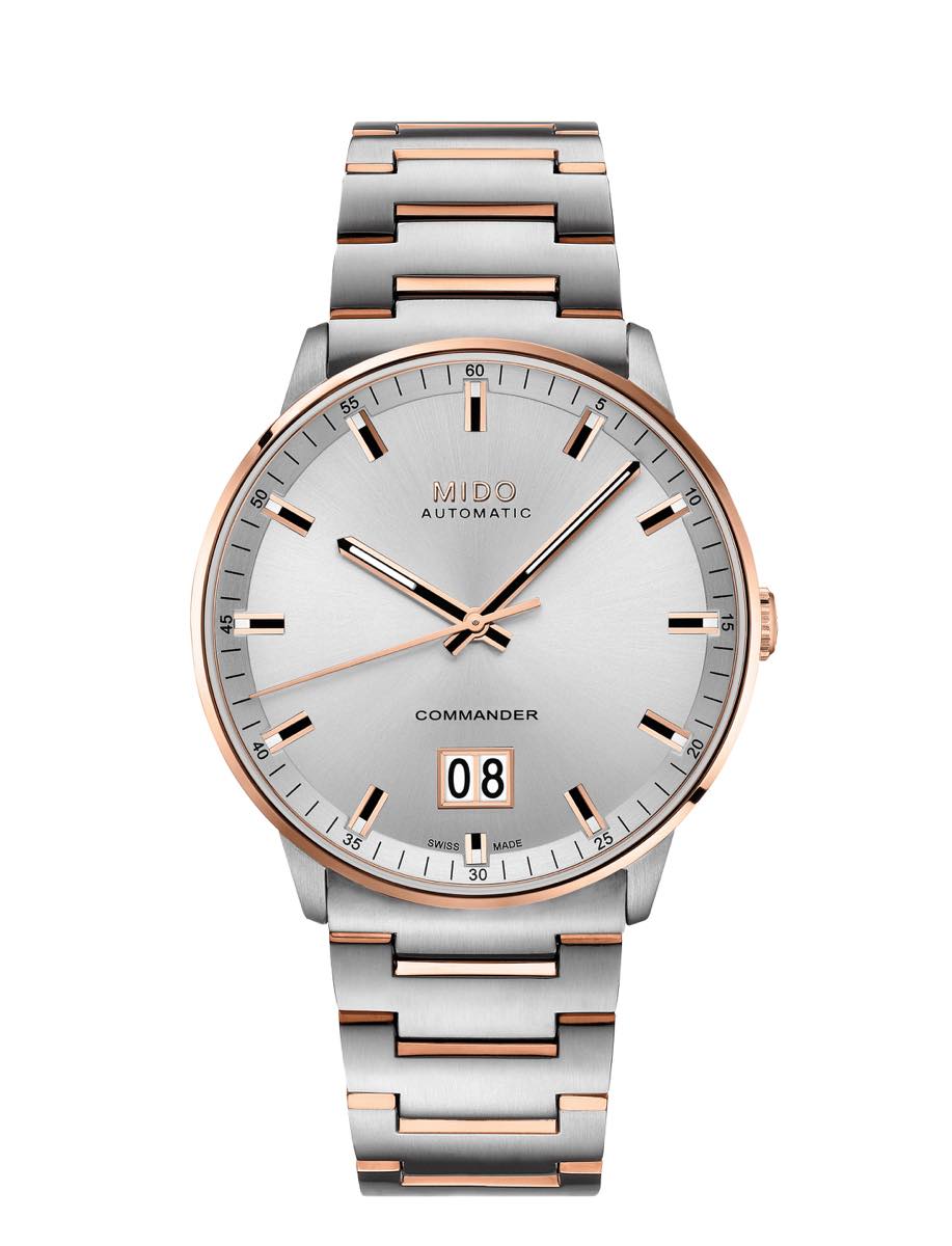 オートマチック、 MIDO Caliber 80(ETA C07.651ベース)、 径42mm 、 厚さ5.77mm、 サンレイサテン仕上げダイヤル、 ローズ色PVD加工SSケース、 ローズ色PVD加工SSツートンカラーブレスレット、 80時間のパワーリザーブ機能、 シースルーバック、 5気圧防水