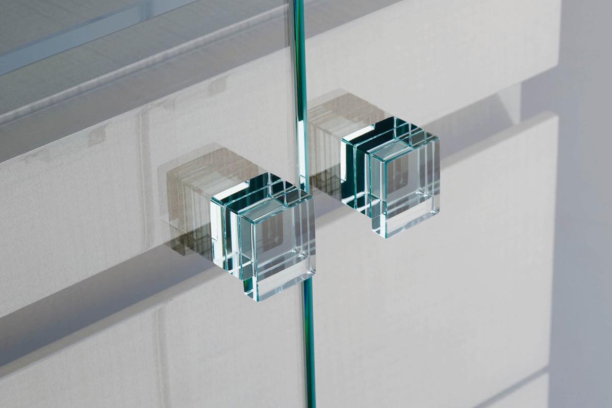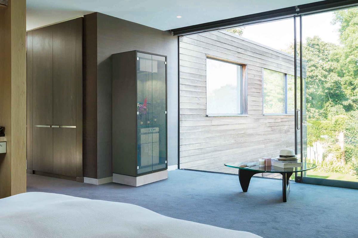 現代仏壇の新作で注目は「グラン クリュ」シリーズ第一弾となる「プローヴァ」。海外の富裕層向け高級家具を手掛ける広島県府中市の松岡家具とコラボして生まれた仏壇で、前面はキュリオケース(コレクションケース)のようなガラス扉、内部の後背板には高級材のシカモアを使用しています。本尊の後ろとなる部分に“光線貼り”と呼ばれる特殊な技術で貼られたシカモア材は、まるで後光を思わせる放射状の模様を描きます。