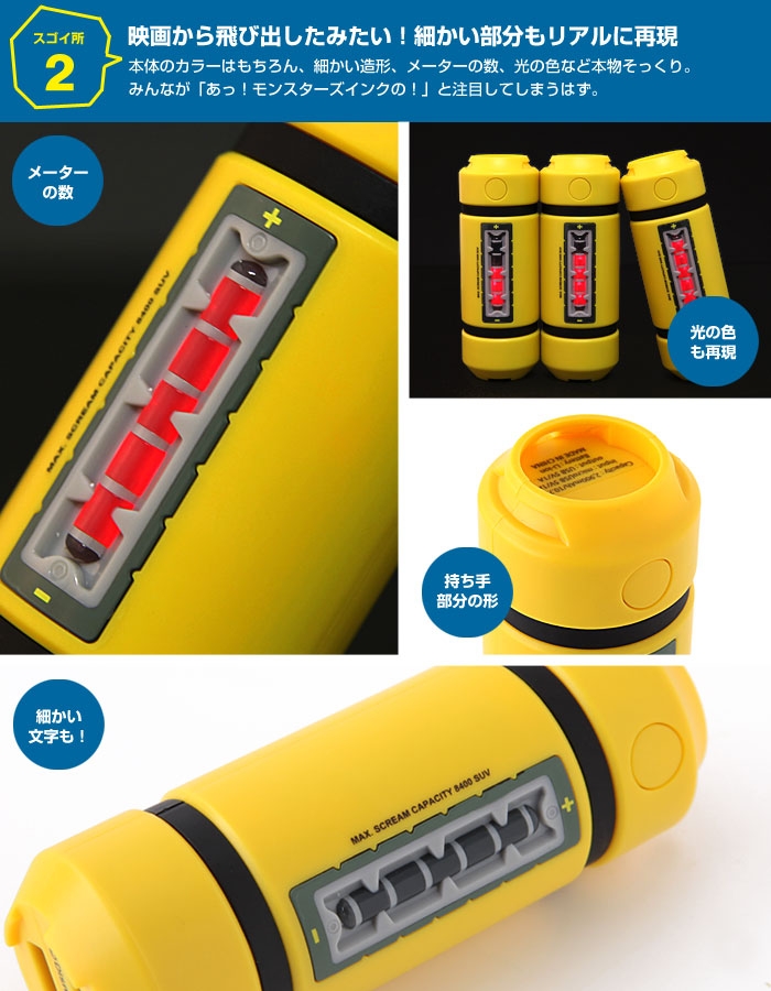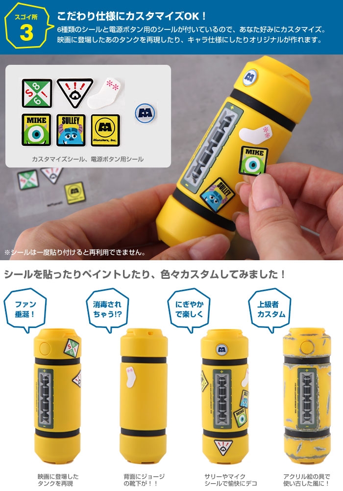 本体の色はもちろん、メーターの数や光の色、本体の細かい文字などもリアルに再現されている。付属のケーブルもイエローで、モンスターズ・インクのロゴマークを配している。電源ボタンシール、カスタム用シールも付属するので、劇中に登場するタンクを再現するもよし、自分好みにカスタマイズするもよし、自由に遊べるのも従来のバッテリーと違うところだ。