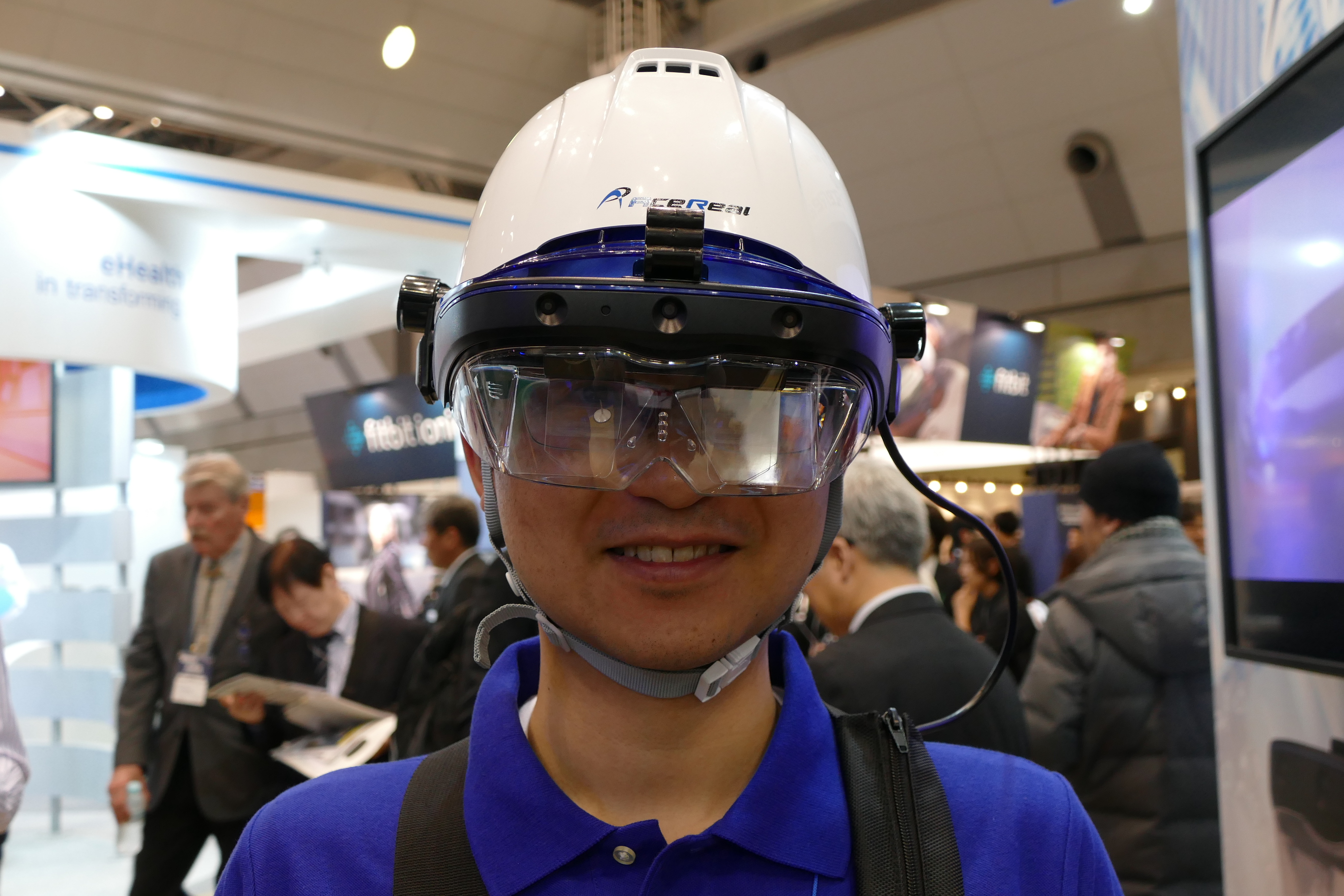 ▲サン電子株式会社が提供する「AceReal」はヘルメットと一緒に装着でき、防塵防滴性能(IP54準拠)を備える。会場では3D映像を映し出すデモが展示されていた