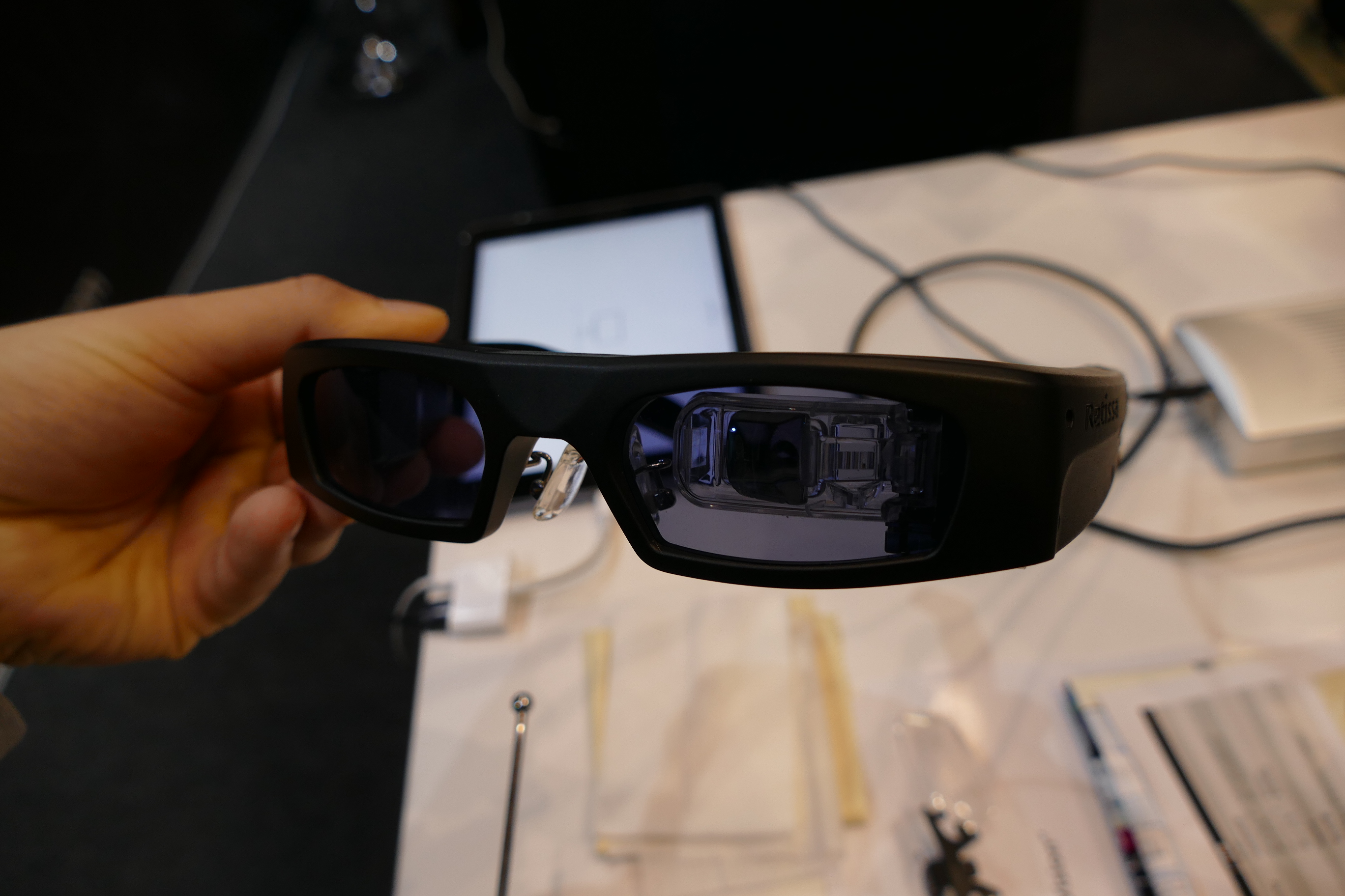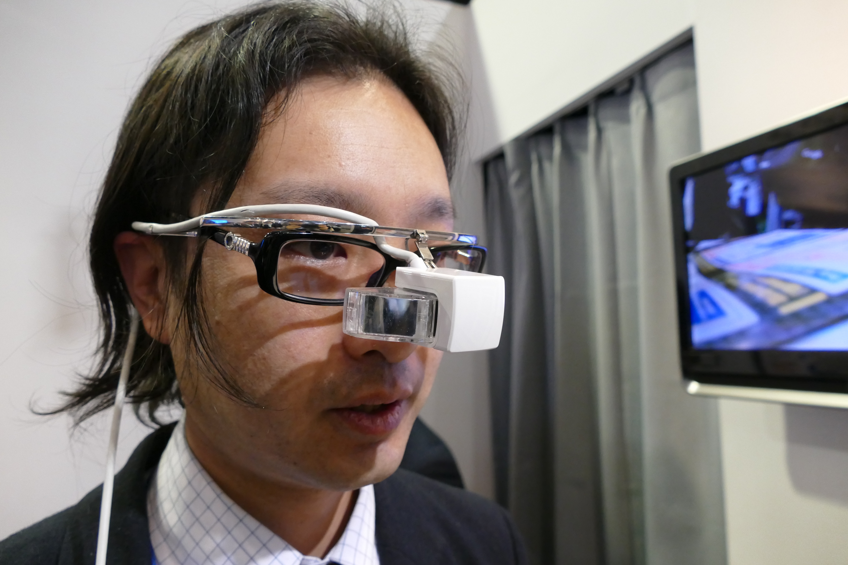 さて、そんな乱立する眼鏡型デバイスコーナーで目立っていたのが、QDレーザが展示していた「RETISSA Display」です。こちらは、小型プロジェクタで網膜に直接映像を投影するという技術が目新しく、体験コーナーには長蛇の列ができていました。