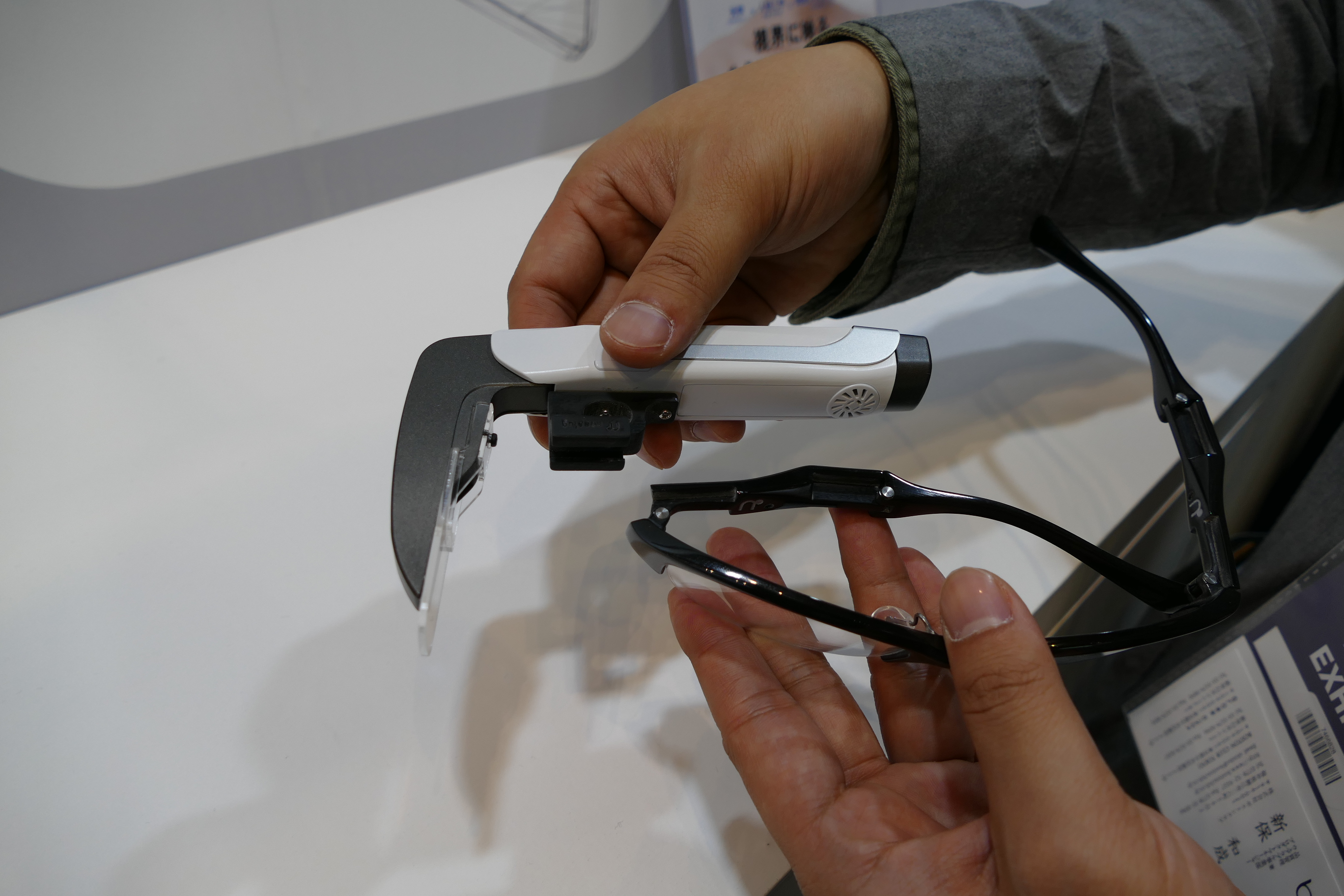 ▲エンハンラボが展示する「b.g.(ビージー:beyond grassesの略)」。眼鏡の上からかけられるのが特徴で、上下に2段階で位置を調整できる。残念ながら展示品はモックアップで、使用感は分からなかった