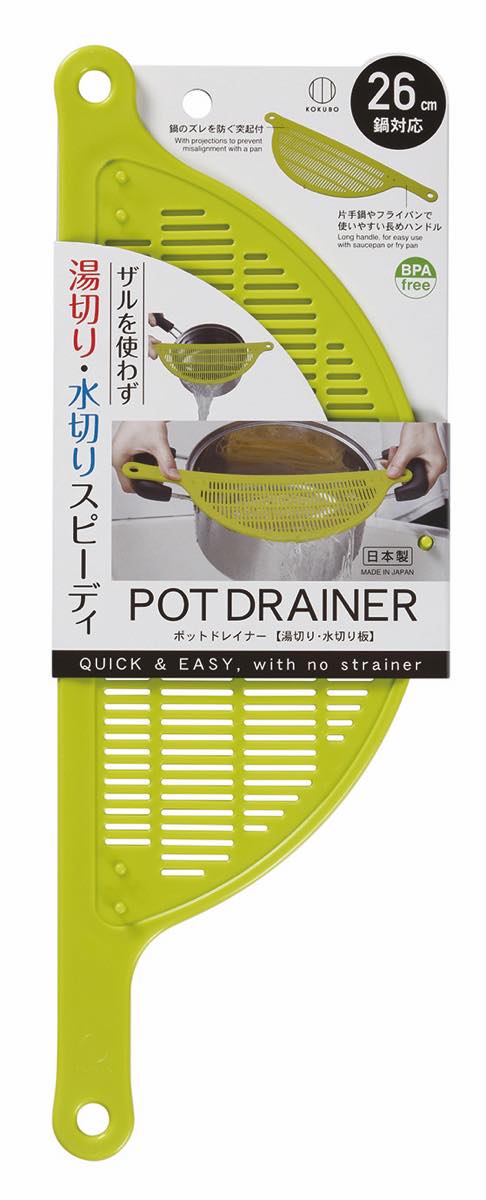 小久保工業所から登場した「ポットドレイナー」(216円/2月15日発売)。半月型の不思議な形状ですが、これが実はスグレモノ。鍋やボウルに当てることでカンタンに水切りができるんです。その秘密は3カ所についた突起。