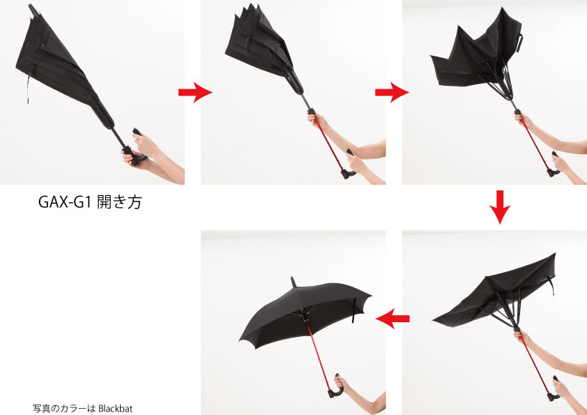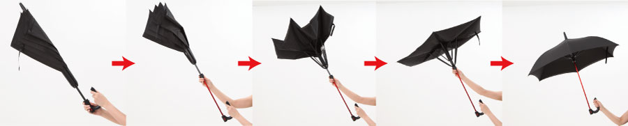 本品は開いた状態は普通の傘と同じ。逆に開けると口でいうのは簡単だが、スムーズに傘骨を作動させ、普通の傘のように開くのは難しい。思った以上に複雑な動きをする傘骨を制御し、10年をかけて実用化。特許取得済だ。