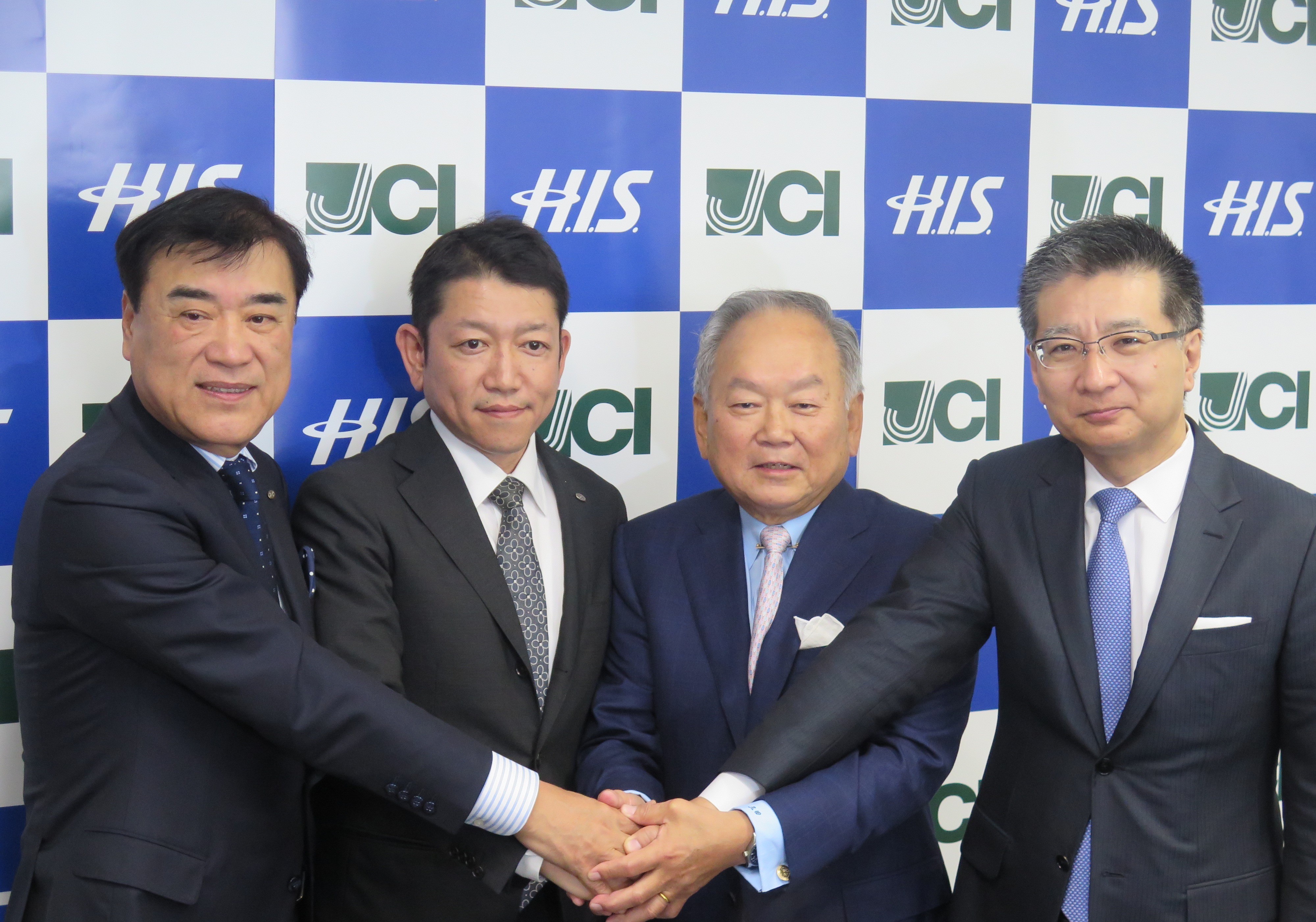 ▲左から、エイチ・アイ・エス 代表取締役会長兼社長の澤田 秀雄氏、H.I.S.Mobile 代表取締役社長の猪腰 英知氏、日本通信 代表取締役会長 三田 聖二氏、日本通信 代表取締役社長の福田 尚久氏