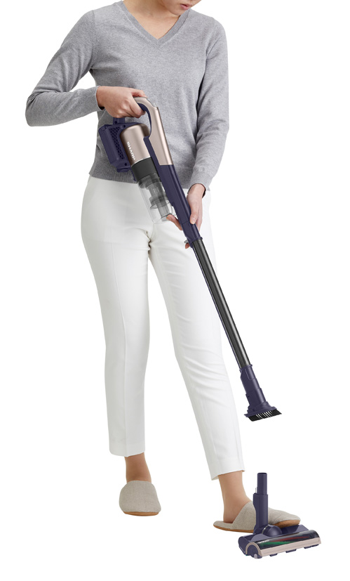また、掃除機と言えば吸込口を付属ノズルに差し換えるためにかがみこんだり手を伸ばしたりするのが手間ですが、その点もしっかり解決。「スグトルブラシ」はワンタッチで吸込口が外れ、パイプ先端を掃除ブラシにチェンジ、狭い場所や段差などをサッとキレイにできます。さらに外した吸込口のパイプ部は倒れず自立し、ブラシ掃除が終わった後もかがまずに吸込口を装着、床掃除をスムーズに再開できます。