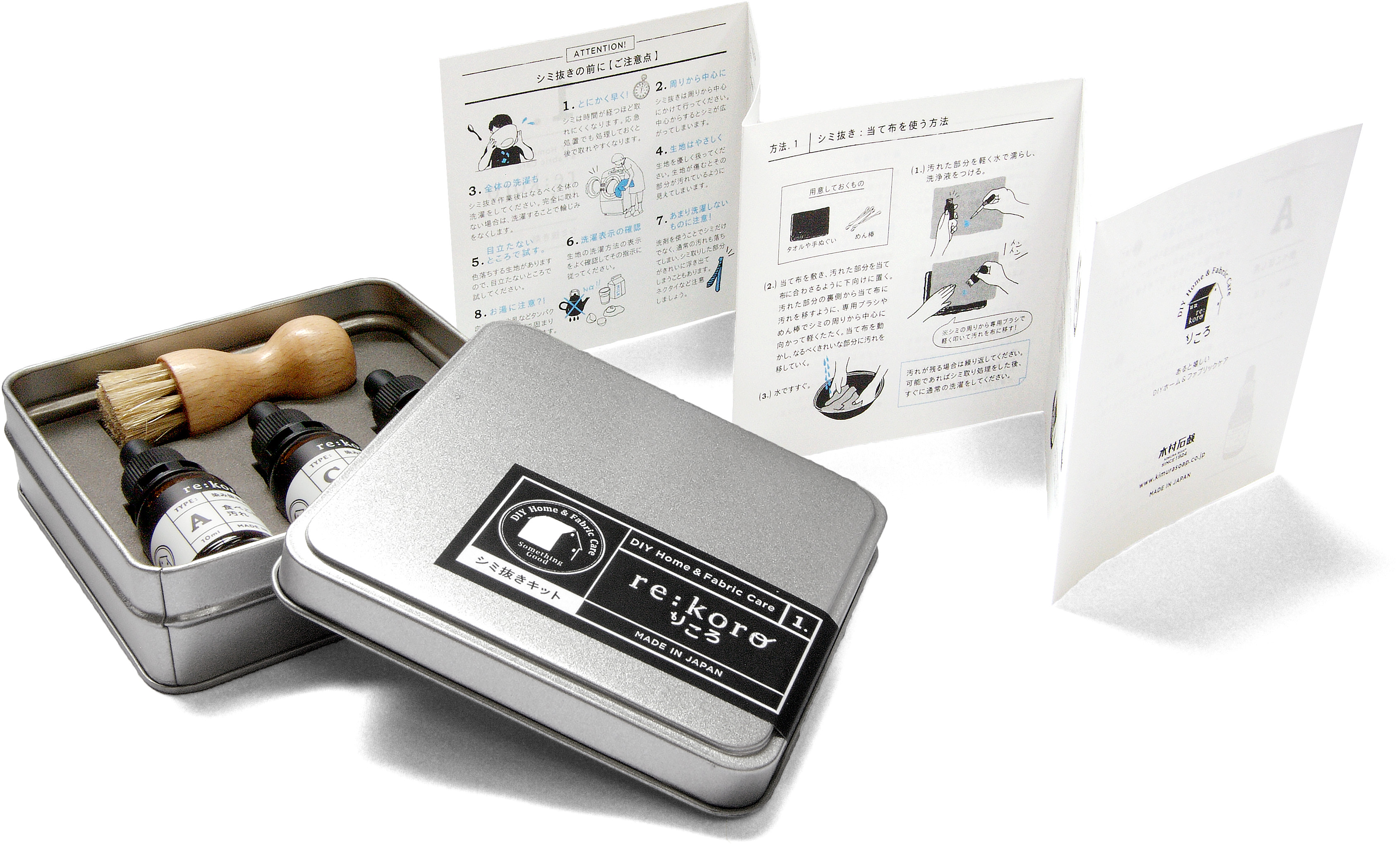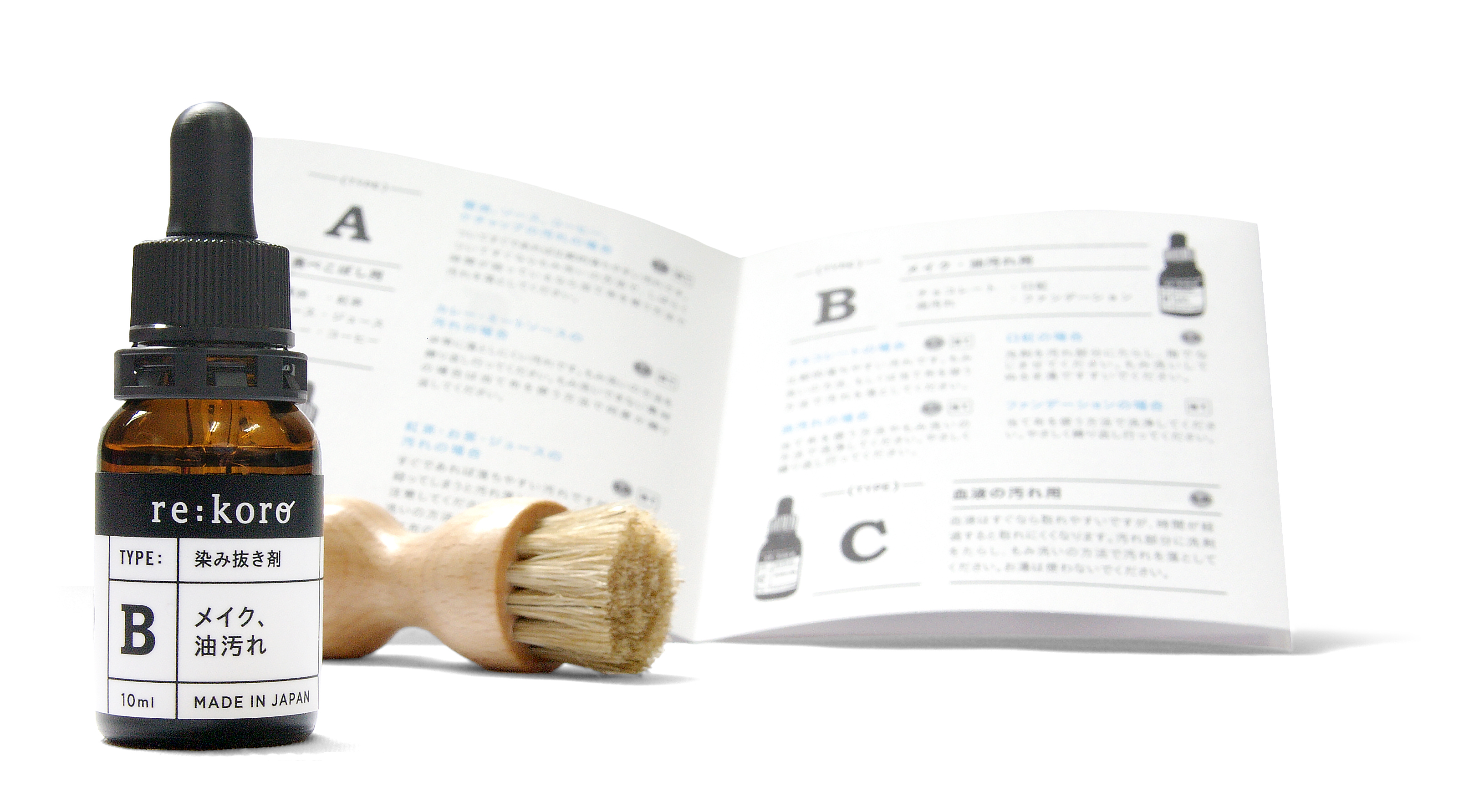 re:koroのシミ抜きキットには、汚れの種類に応じて使い分けられる3種類の溶剤、シミ抜きに適したドイツ製の天然豚毛ブラシ、シミ抜き解説書がセットされている。食事の汚れはもちろん、メイクの色移り、血液汚れにも対応可能。また3つのシミ抜き剤を掛け合わせることで、複雑な汚れにも対応できるようになっている。