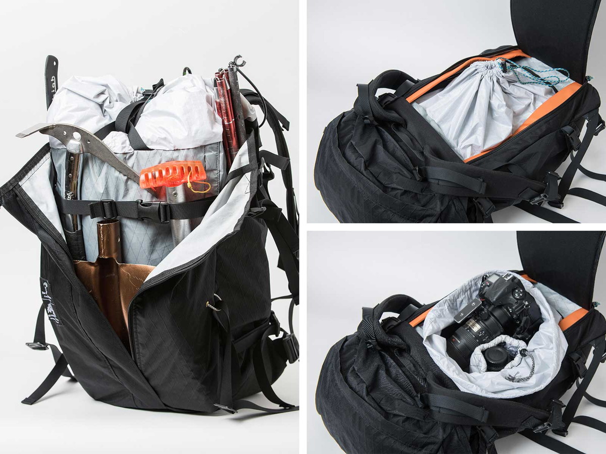 さらに表側は、レスキューギアやクライミングギア、小型の三脚、テントポール、レインギアといった、できれば濡らしたくないが荷物と一緒に入れたくないモノ、必要なときに素早く取り出したいモノを入れられるよう、メイン気室とは別の収納部を設置。コンプレッションベルト付きで、収納したギア類は固定できるようになっています。