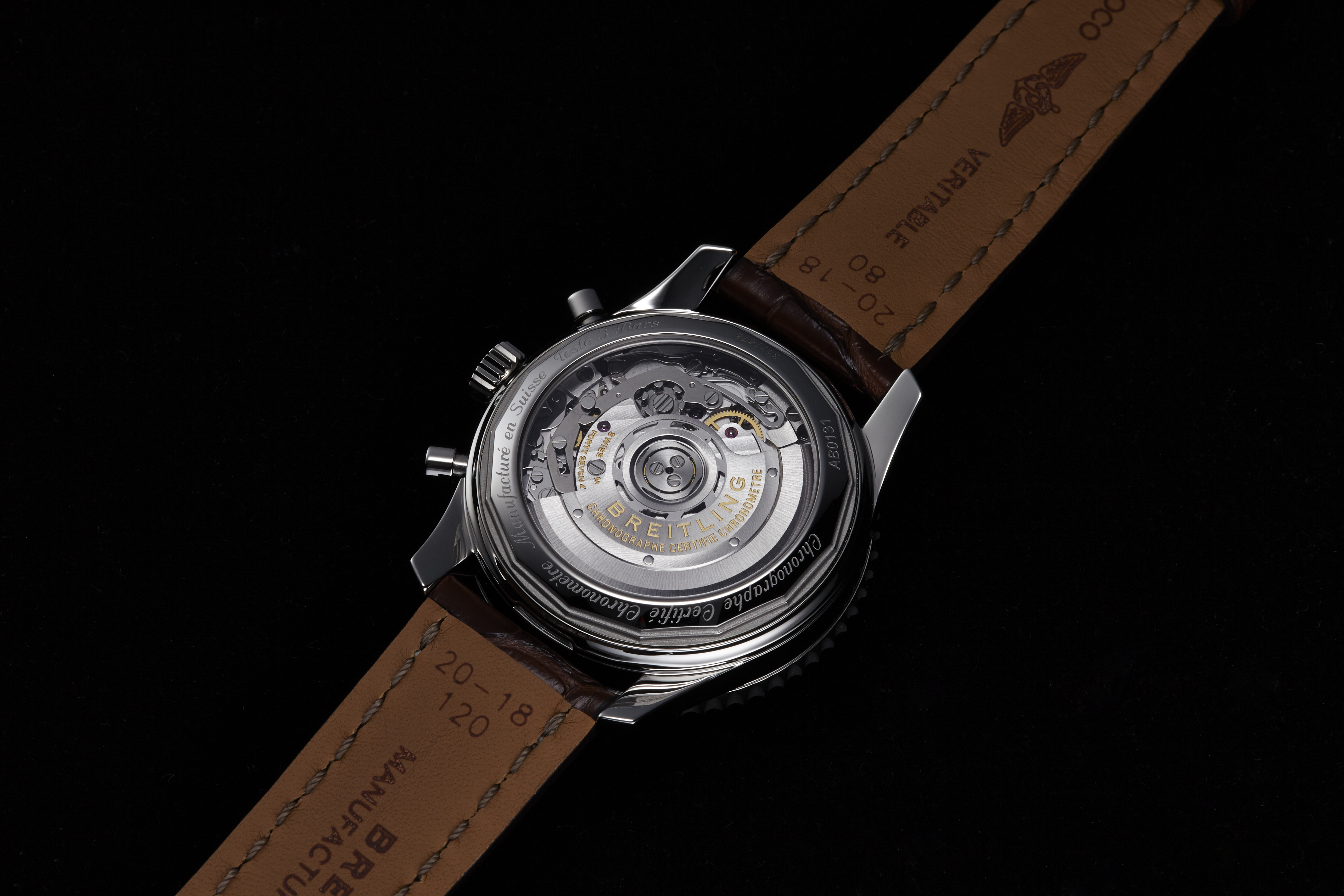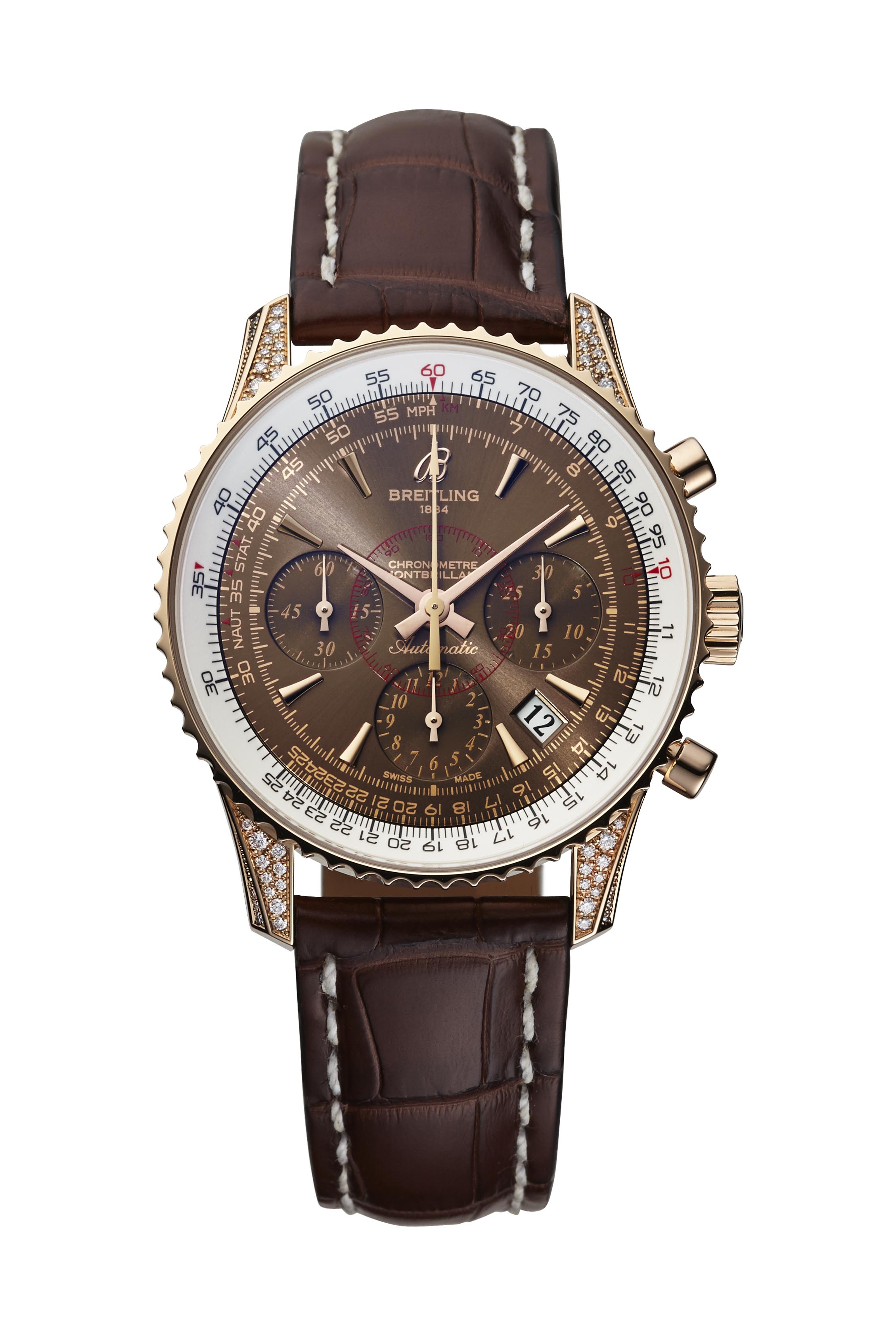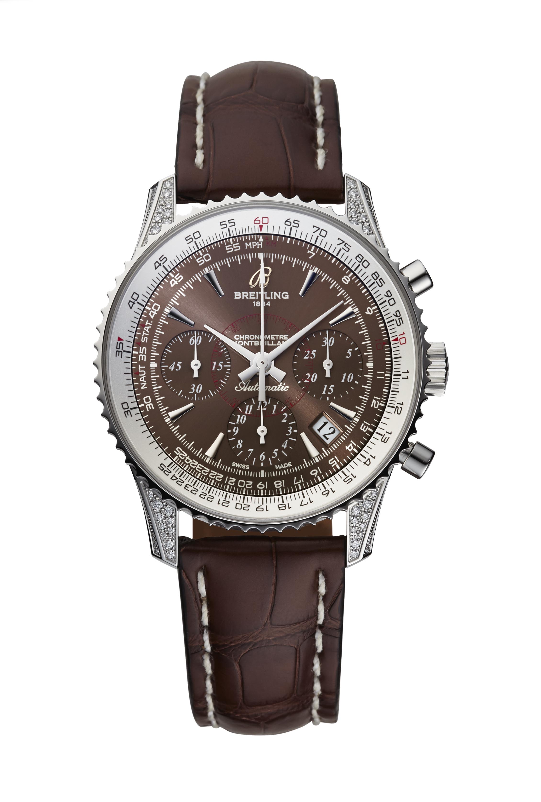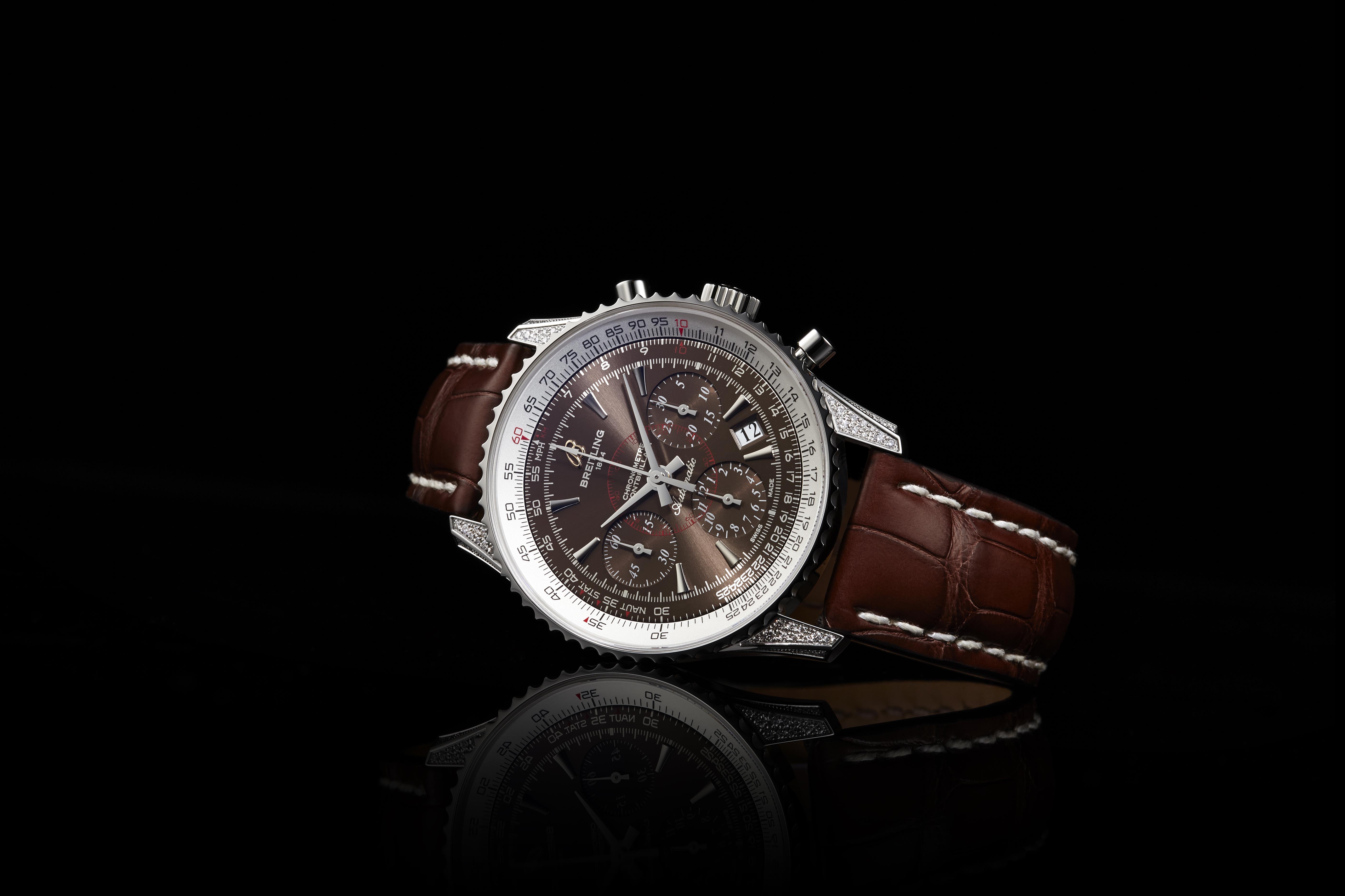 ブライトリングがこのような店舗とコラボレートする形でリミテッドモデルをつくるのは初めて。その装いは、クラシックな計器を思わせる重厚なデザインに、ブラウンを基調にしたカラーリング。秋冬のジャケットスタイルにもぴったりの上品な雰囲気を醸し出している。