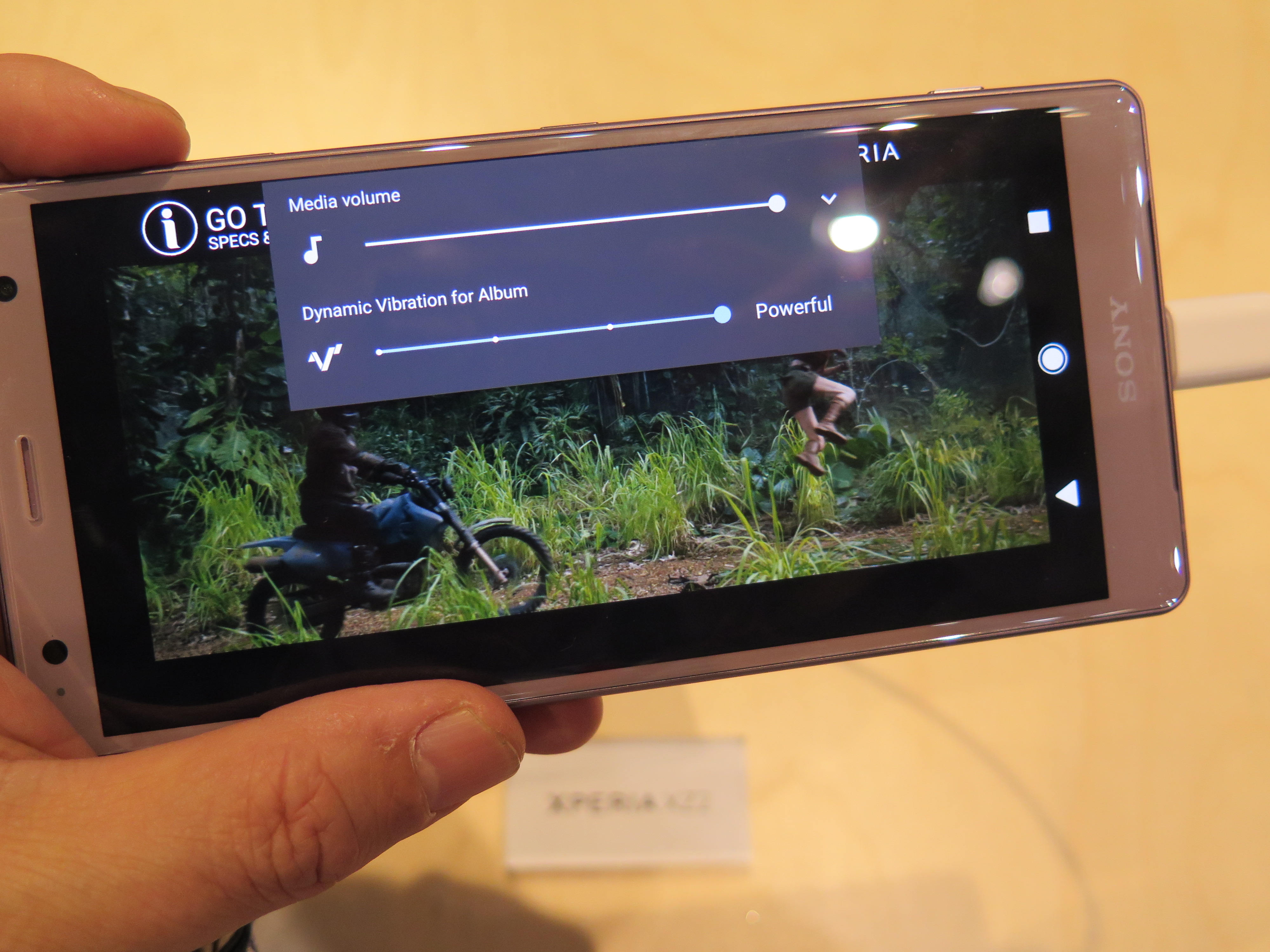 ▲XZ2には標準的なバイブレーターよりも大きな独自開発のバイブレーターを搭載し、たとえばアクション映画を観る際に、スマホを持つ手で、シーンに合わせた振動も楽しめる仕組み