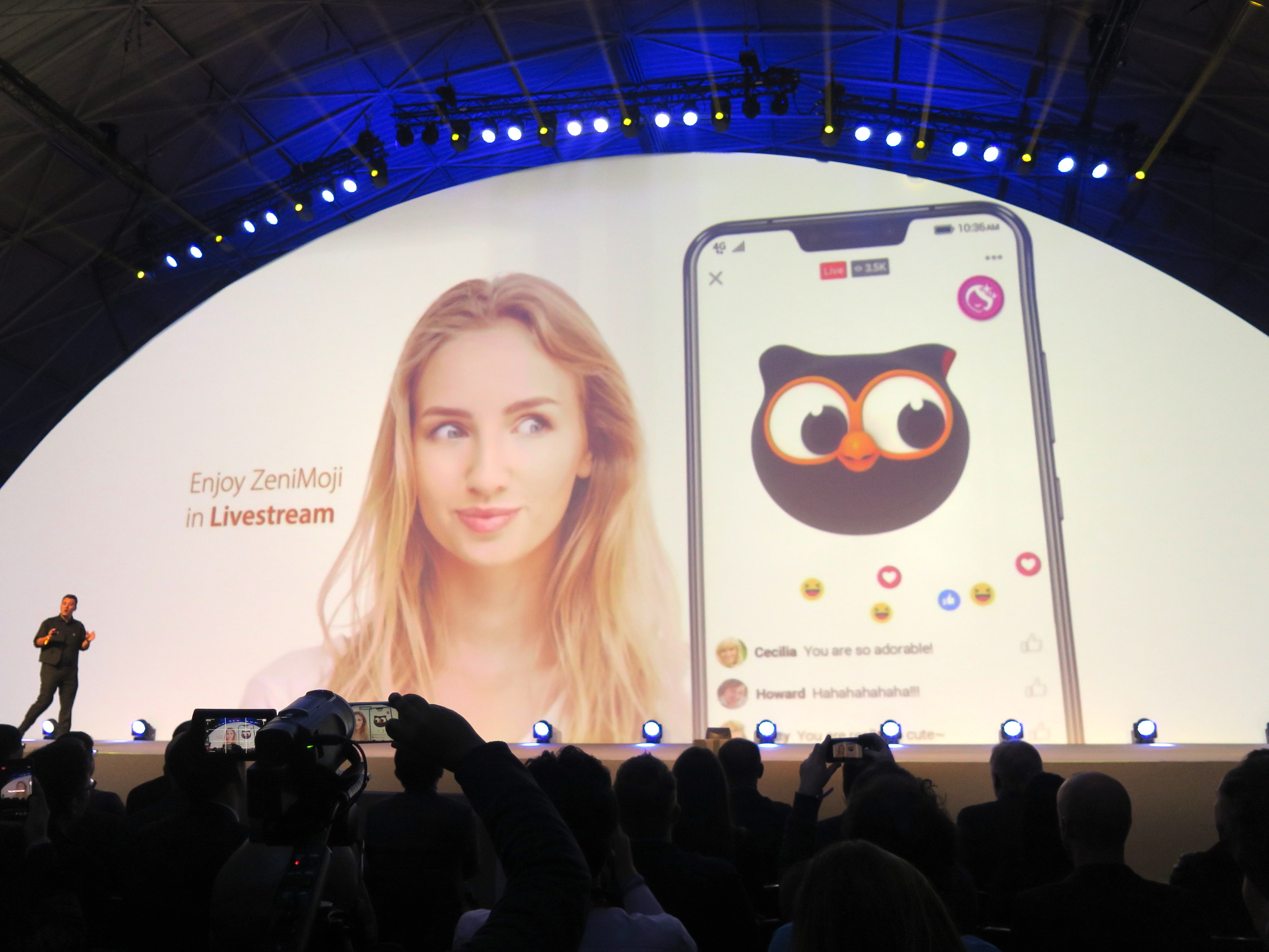 プレゼンテーションでは “Fruit Phone X” という端末との比較が紹介され、ZenFone 5のほうがノッチが狭く、画面占有率が高いことをアピール。背面にはダブルレンズカメラを搭載し、やはりiPhone Xと同じように、左上に2つのレンズを縦に並べて配置。さらに、ユーザーの顔の表示に合わせて動く絵文字「ZeniMoji」も搭載。これは、明らかにiPhone Xの「アニ文字」を意識したもので、会場から笑いも起きました。ここまでやるか、っていうのが率直な感想です。