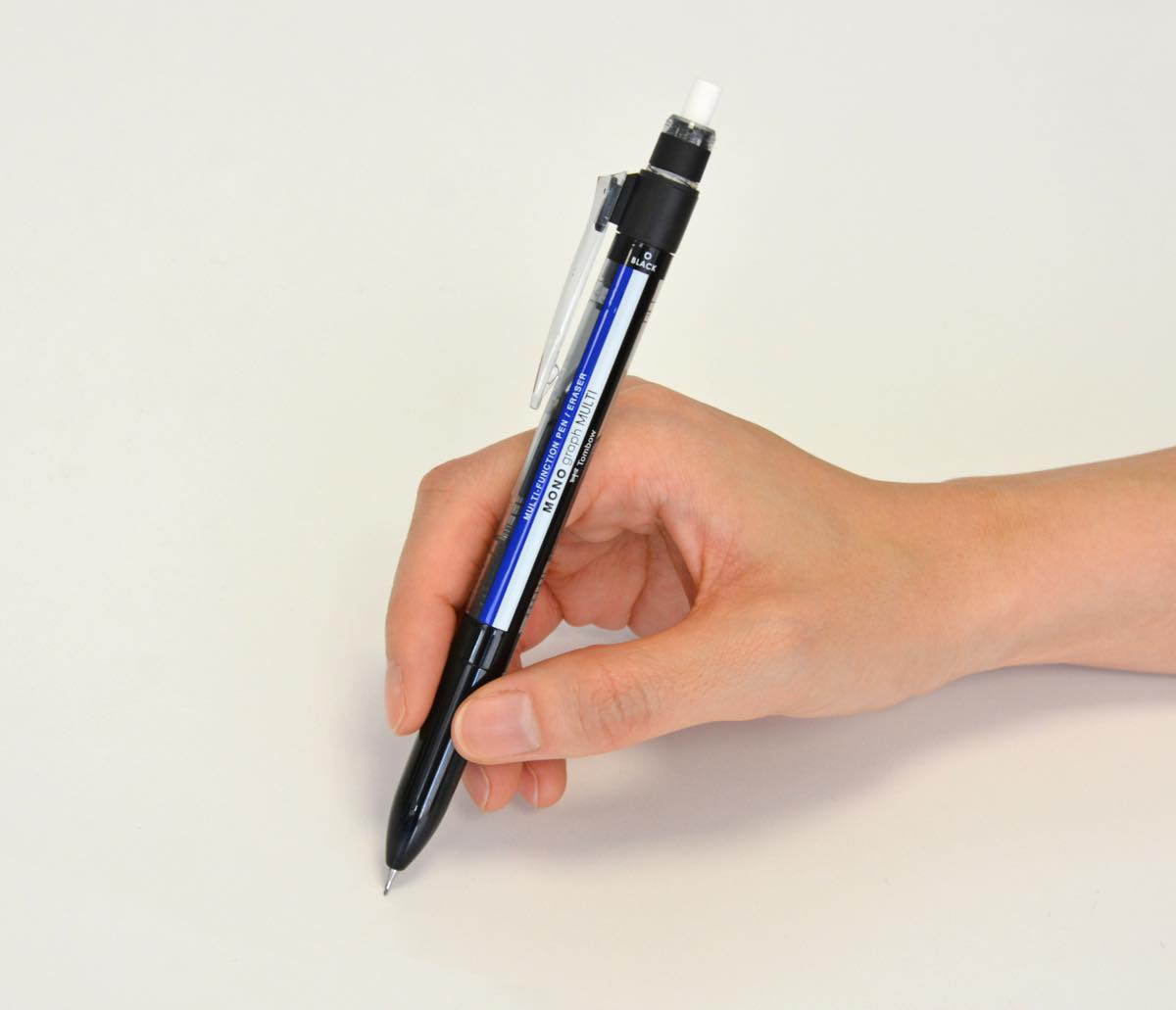 中でも特筆すべきは消しゴムの長さ! なんと通常の多機能ペンについている消しゴムの約6倍以上(実用平均体積比)もあるんです。直径5.3mmの繰り出し式で、一字消しや一行消しに最適なサイズ。もちろんMONOというだけあって、消し味はバッチリ!