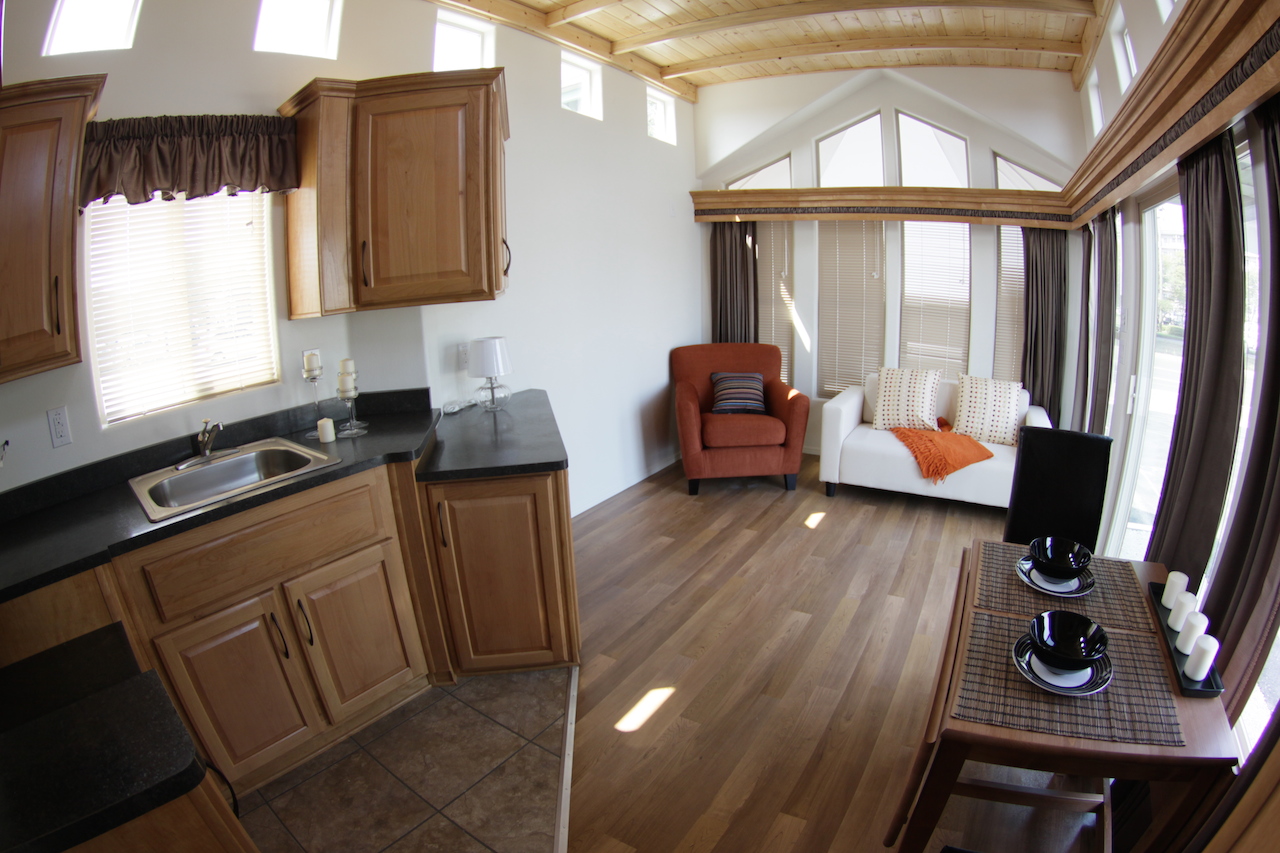 室内の広さは最大50㎡とコンパクトながら、本格システムキッチンや浴槽付きバスルーム、水洗トイレやロフトスペースなども備えつけ可能。