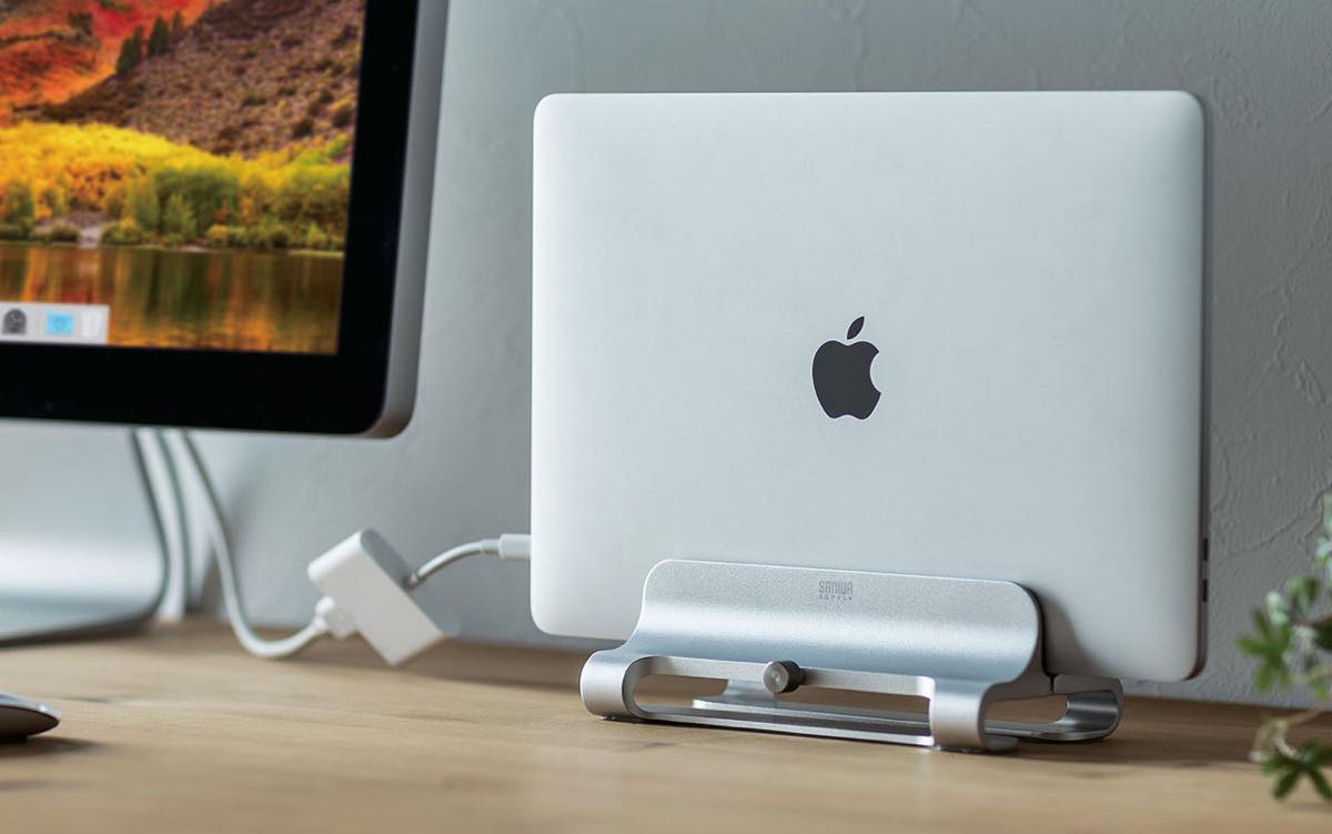 サンワサプライから登場した「ノートパソコン用アルミスタンド」(7538円)はノートPC用のアルミスタンド。厚さ30mm以内のノートPCを閉じた状態で収納できるほか、iPad Proなどの各種タブレットにも対応しています。