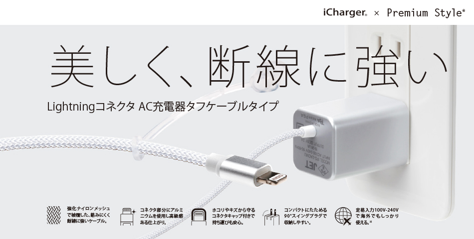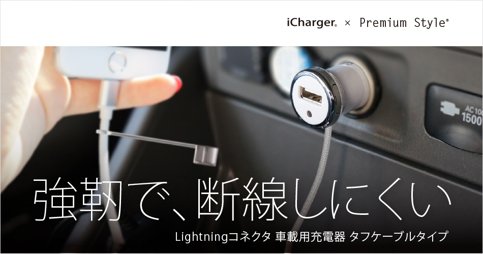 AC充電器タフケーブルタイプ 1Aモデルが2980円、2.1Aモデルが3480円。車載用充電器タフケーブルタイプが2980円。また、ライトニングーUSB端子のタイプも2280円で入手できる。