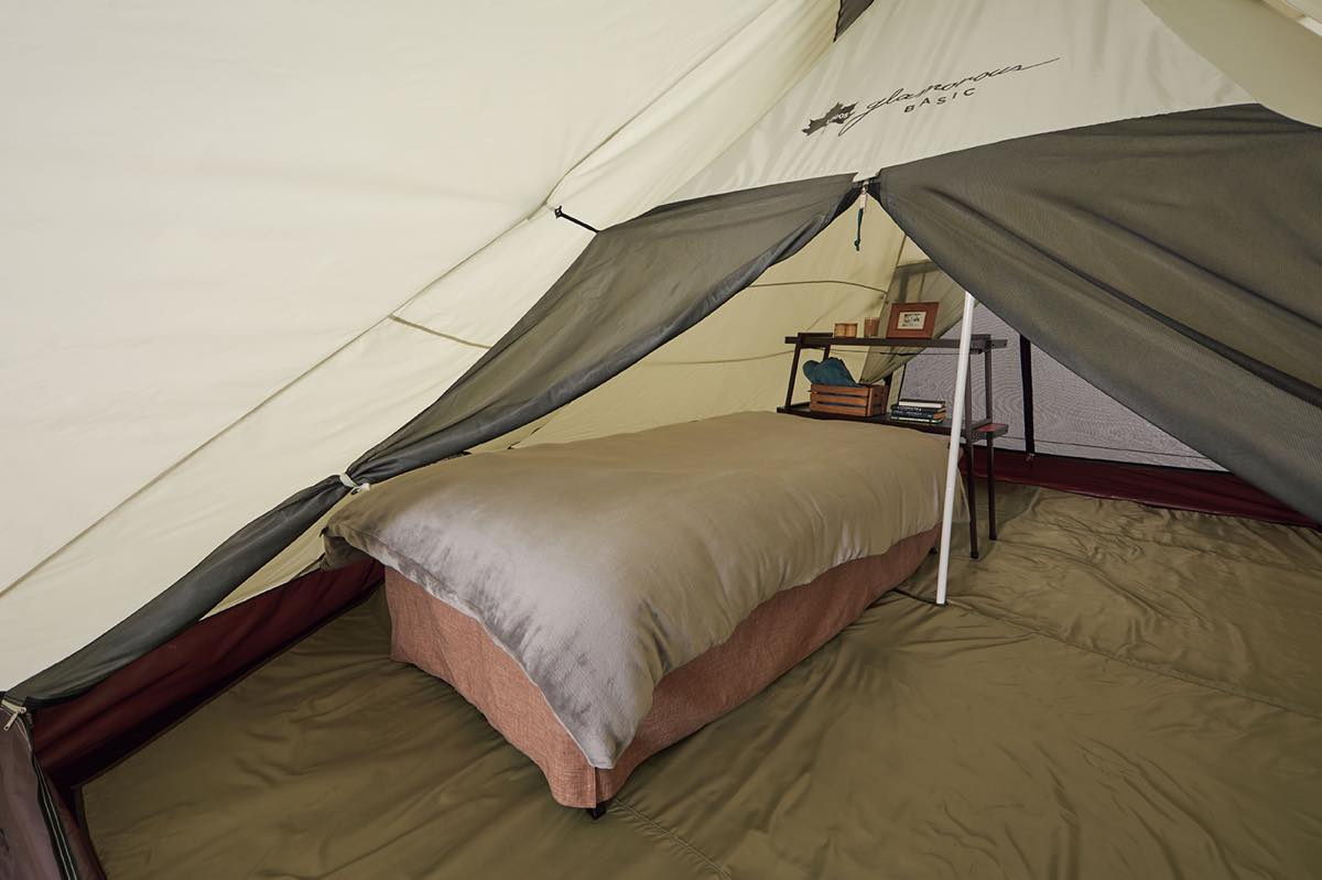また、円錐型のデメリットである設置面積の広さに対し、室内が狭い・天井が低いという点は、インナーテントの下部を立ち上げることで、解決。有効スペースを拡大し、大型ベッドを置いても広々使える面積を確保した。