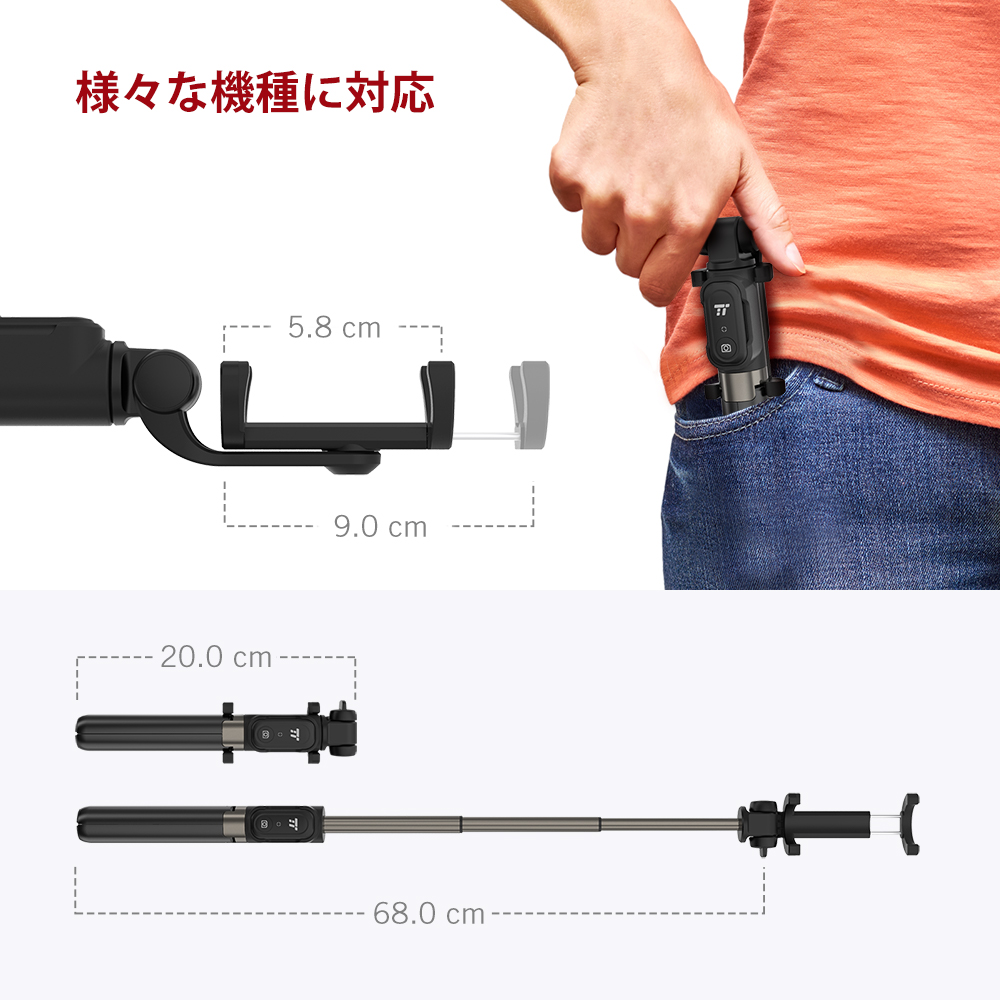 「TT-ST002」の本体は、軽量かつ丈夫なアルミニウム合金製で、最大68cmまでバーの延長が可能。3つのジョイントがスマホをしっかりホールドします。セットしたスマホの向きや角度を自由に設定できる回転式を採用しているので、手持ちでは撮りにくいアングルでも簡単に撮影できます。また、このジョイント部を取り外すことでカメラマウントとしての使用も可能。GoProなど1/4"径のネジ穴を搭載したアクションカメラを設置できます。