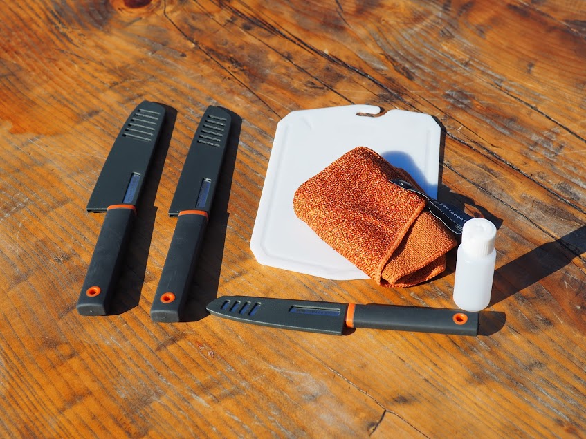SANTOKUナイフ4インチ、6インチ、小型ナイフ、まな板、ソープボトル、ふきんとケースの7点セットです。ケースはバリスティックナイロン製で耐久性もバッチリ!