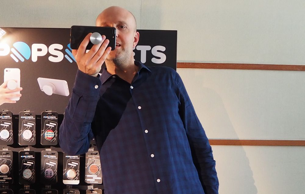 ▲来日した創業者兼CEOのデイビット・バーネット氏。5月発売予定のポップソケッツ・グリップのツイストをつけている。横位置での撮影も片手で安定