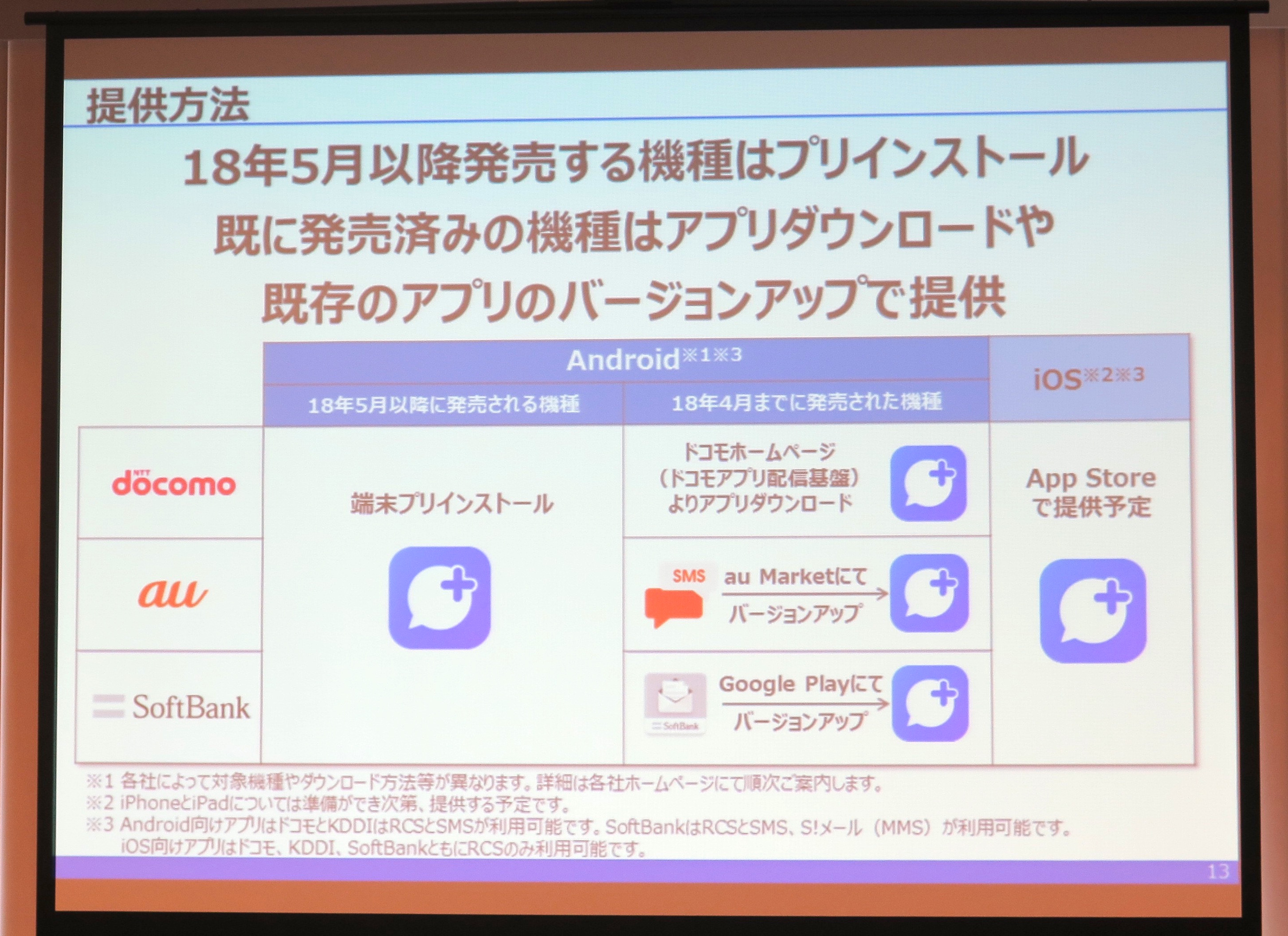 3キャリアが5月以降に発売するAndroidのスマホ・タブレットには、+メッセージの専用アプリがプリインストールされます。すでに3大キャリアのAndroidのスマホ・タブレットを使っている場合は、ドコモはドコモのホームページから専用アプリをダウンロード、auは既存の「SMS(Cメール)」アプリをアップデート、ソフトバンクは既存の「SotfBankメール」アプリをアップデートすることで使用可能となります。
