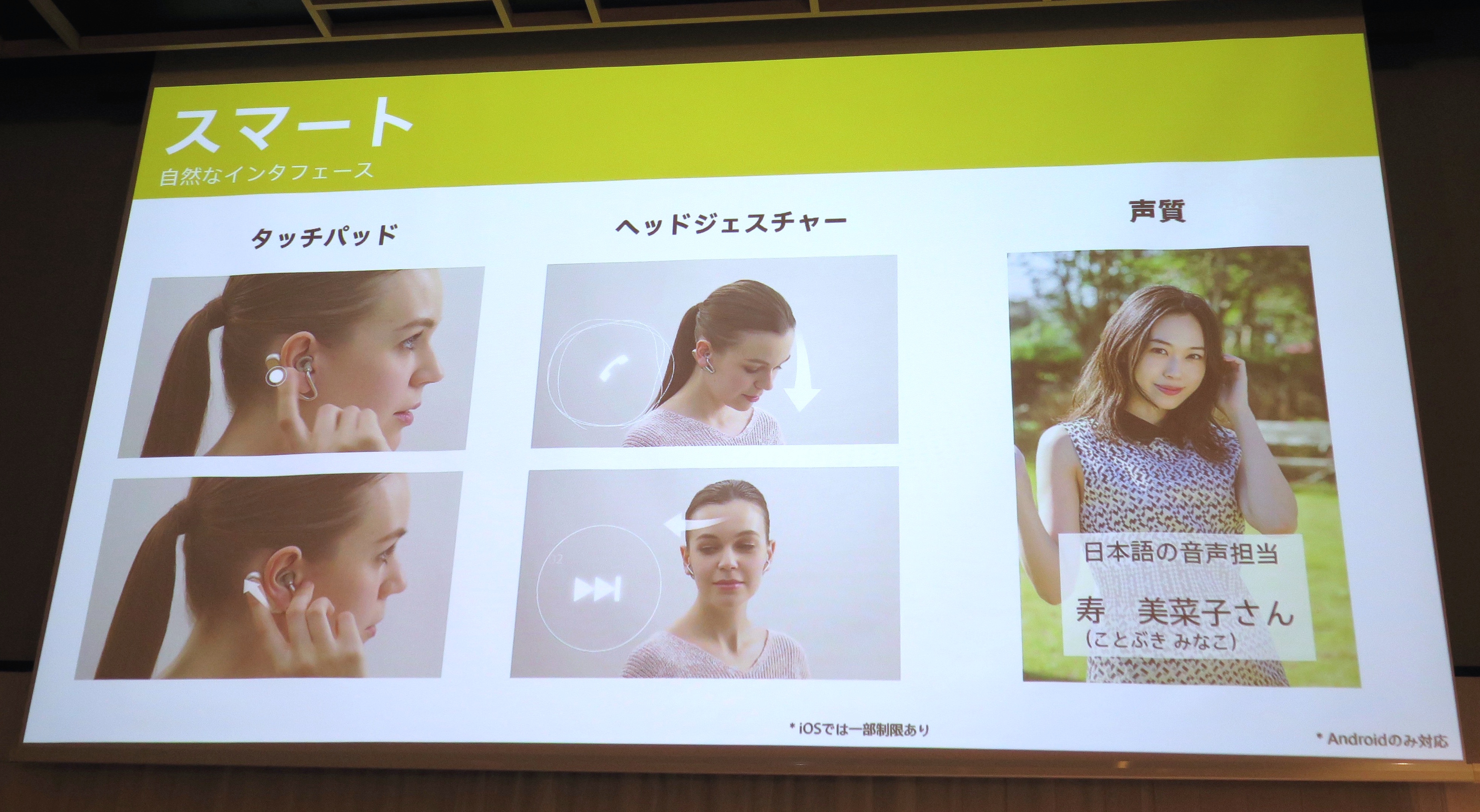 Xperia Ear Duoのもう一つの特徴が、声やジェスチャーで操作できるスマート機能だ。ソニーモバイル独自のボイスアシスタント「Assistant for Xperia」に対応し、話しかけるだけで電話の発信や音楽の再生などができる。Xperia Ear Duoをタッチしたり、なぞったりして操作できるほか、首を動かすジェスチャー操作にも対応。電話の着信時には、首を縦に振るだけで応答でき、音楽再生時には、首を左右に振って次の曲、前の曲と変更できる。なお、LINEの「Clova」とGoogleにも対応。これらのボイスコントロールはAndroidのみの対応だが、Siriにも対応しているので、iPhoneのユーザーも同じようにハンズフリーで電話発信、音楽再生などができる。